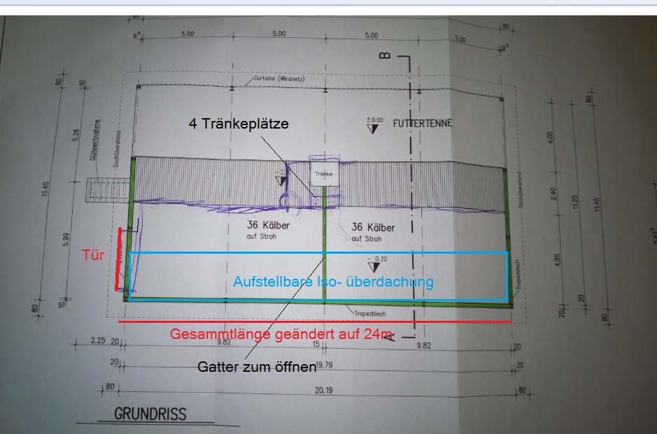 Nach dem Plan stehen jedem Tier 1,5m² Stroh-Fläche zur verfügung, könnt ihr abschätzen wie häufig dort Nachgestreut werden müsste? Ich hab da leider keine Erfahrungen, unsere jetzigen Kälber werden auf Bongossi aufgezogen und Strohställe die ich besichtigt hab haben immer nach dem Absetzen ausgestallt.