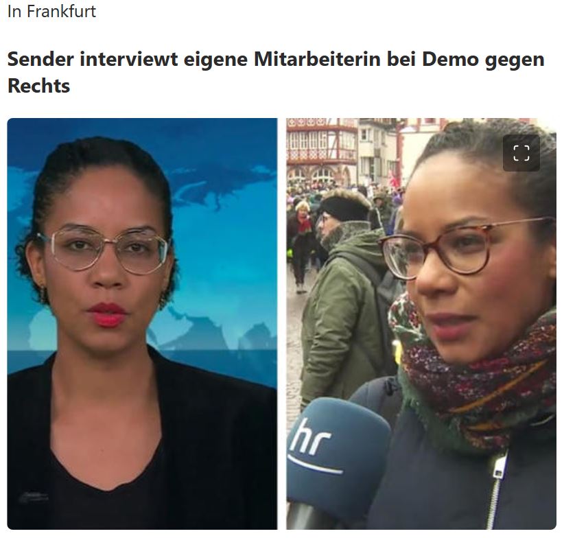 Im Intro des entsprechenden Beitrags hieß es, dass „Autorin Hadija Haruna-Oelker“ mit dabei war – eine Kennzeichnung zu ihrer Tätigkeit für den HR war für den Zuschauer nicht zu sehen. Es hieß im Beitrag lediglich, Haruna-Oelker sei „Teil der Initiative Schwarze Menschen in Deutschland“. Nach kritischen Hinweisen auf X (ehemals Twitter) musste sich der Sender erklären: „Wir haben Hadija Haruna-Oelker als Teilnehmerin der Demonstration gegen Rechtsextremismus in Frankfurt interviewt. Dabei ist uns ein Fehler unterlaufen. Wir hätten im Beitrag kenntlich machen müssen, dass sie auch als freie Mitarbeiterin für den HR tätig ist“, hieß es von der Redaktion der Hessenschau.