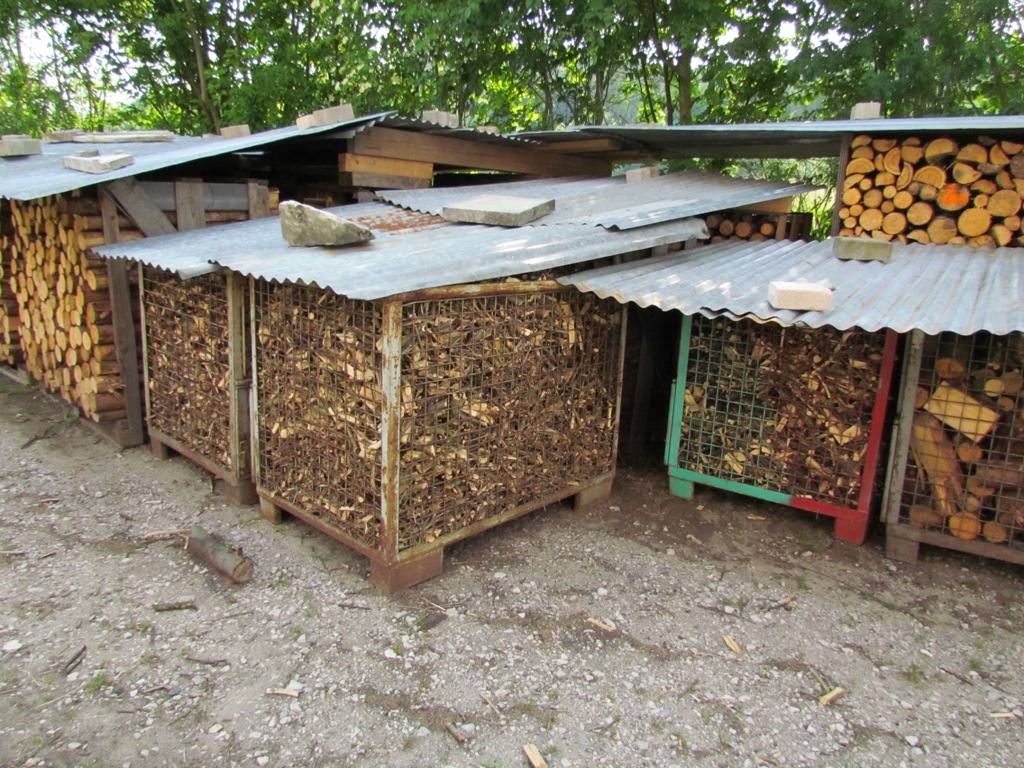 Wir haben auch noch einige alte Gitterboxen, diese nutzen wir für alles was man nicht schlichten kann, fürs Scheitholz haben wir selbst gebaut Paletten aus Holz Hab leider kein besseres Bild von den Holzpaletten zur Hand.