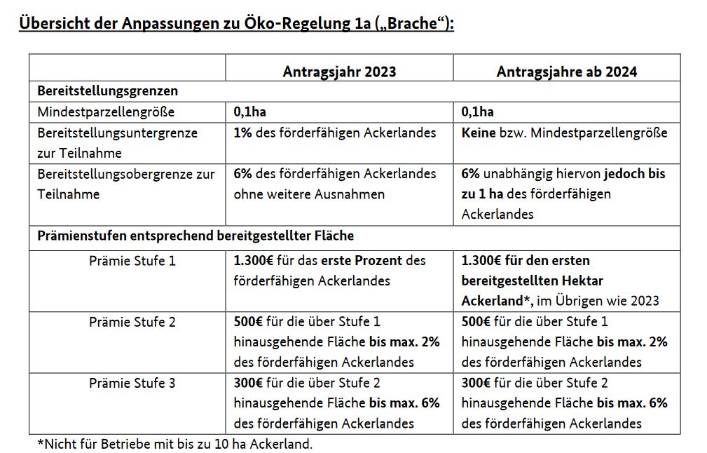 Die vorgesehene jährliche Förderhöhe beträgt für das erste Prozent Ackerland 1.300 EUR / ha, bis zum zweiten Prozent 500 EUR / ha und danach bis zum sechsten Prozentpunkt 300 EUR / ha. Ab dem Antragsjahr 2024 können Betriebe mit mehr als 10 ha Ackerland für das erste Hektar Brache den höchsten Förderbetrag von 1.300 EUR/ha bekommen, auch wenn dies mehr als 6 % der Ackerfläche des Betriebs ausmacht. Die Anlage eines Blühstreifens oder einer Blühfläche wird ab dem Antragsjahr 2024 mit 200 EUR / ha gefördert. Für Altgrasstreifen oder -flächen sind Förderbeträge für das erste Prozent in Höhe von 900 EUR / ha, bis zum zweiten Prozent in Höhe von 400 EUR / ha und danach bis zum sechsten Prozentpunkt in Höhe von 200 EUR / ha vorgesehen.