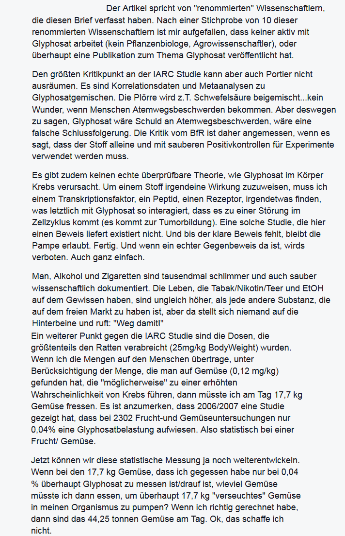 siehst du was dieses Gessindel sich wieder zurecht ausdengt? Das kann ja wohl nicht wahr sein oder träume ich schon wieder mit ofenen augen? das die uns hier wieder erzählen wolen das glyphosaht ungefärlich ist. sowas habe ich noch nicht erlebt und du? was machen wir? wir müssen uns verbinden den es sint raihenweise mütter und töchter, väter und önkel die betroffen sindt. ich habe so einen schock in mir drinn. mir isst doch klatt der brennesseltee und der salbeibombom im rachen stecken geblieben. warum kappiren die nicht wie gut ist bio? wir müsen uns was überlegen, hier sint nur debben. lass uns in den hungerstreick gehen vieleicht bewirkt das ja was. ansonsten bleibt nur zu beten. wir werden ale in ein paar jahren tot sein oder vergiftet rumlaufen wir muntanten. alles wegen glyphosilat.