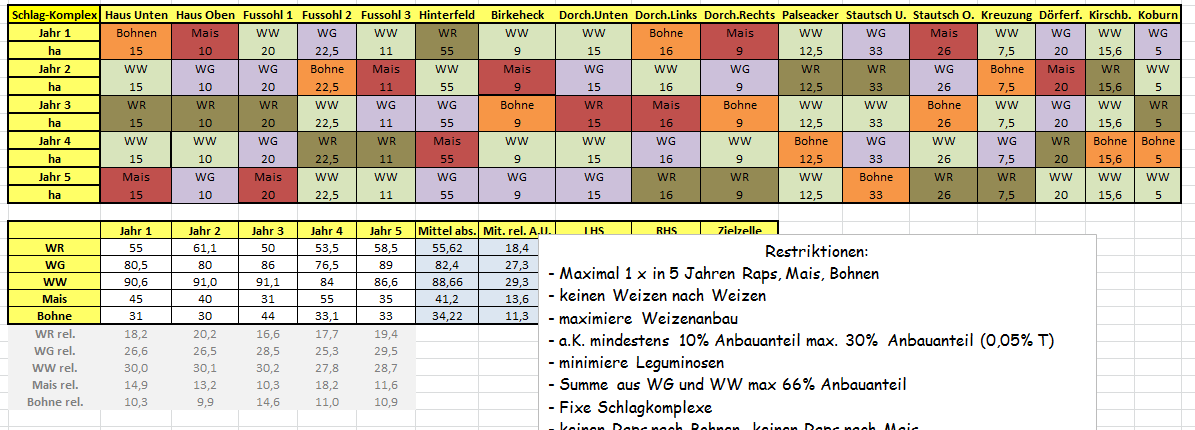 Da das Ganze sich bei strikter Weiterführung der Fruchtfolge auf t2, t3, t4 und t5 durch die unterschiedlichen Anbauverhältnisse und Restriktionen bezüglich Anbaupause einiger Kulturen (Mais will er nicht eng stehen haben, Raps und Leguminosen schließen sich sowieso aus) in der mendelschenart aufspaltet und im Endeffekt für ordentlich Chaos sorgt bzw. Flächenzusammenlegung und strikte Anbauanteile fast unmöglich macht, muss die Fruchtfolge jährlich leicht variiert werden. Es kann also auch mal sein, dass nur 25 % Weizen gebaut werden dürfen oder Leguminosen die 12 % erreichen, die Gerste sich den Platz mit Triticale teilt oder der Rapsanbau noch etwas ausgedehnt wird....... Dadurch wird gewährleistet, dass Weizen nach guten Vorfrüchten steht und vor allem: Man nicht alle Komplexe auseinander reißen muss, denn das ist aus arbeitswirtschaftlichen Gründen nicht vertretbar. Mr. Mustermann hat nämlich nicht alles arrondiert um den Betrieb herum, sondern muss auch mal ein paar km fahren.