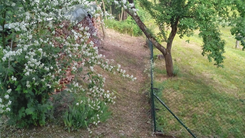 Mein Vater hat hinter dem Haus unterhalb unserer Holzstöße, den Streifen zum Nachbarn hin, mit Freischneider und Motorsäge aufgeräumt. Das Resultat war neben einem sauberen Streifen Grundstück ein ordentlicher Haufen Holz, Busch- und Astwerk. Diesen Haufen haben wir heute nachdem wir aus dem Wald gekommen sind ruckzuck in 4 Raschelsäcke verpackt. Vor der Anschaffung des Pirana war die Aufarbeitung solcher Haufen immer eine echte Herausforderung oder wir haben das Zeug aufs Osterfeuer gefahren, wenn es zeitlich grad gepasst hat.