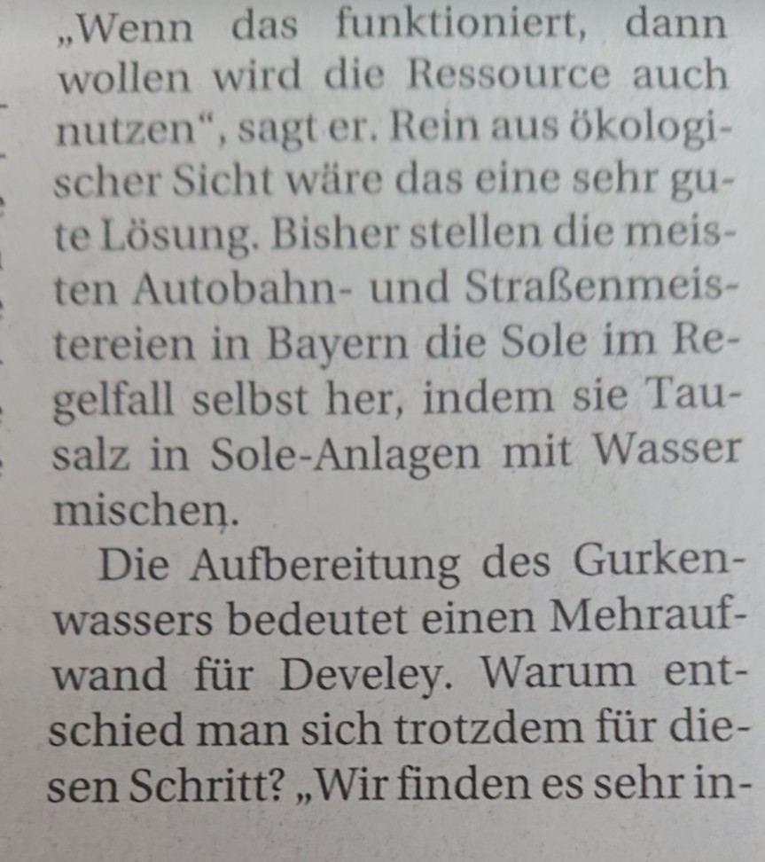 Wenn die schwache Sole durch "Herauskochen" des überschüssigen Wassers auf die nötige Konzntration gebracht wird, scheint mir das sehr energie- und somit kostenintensiv!