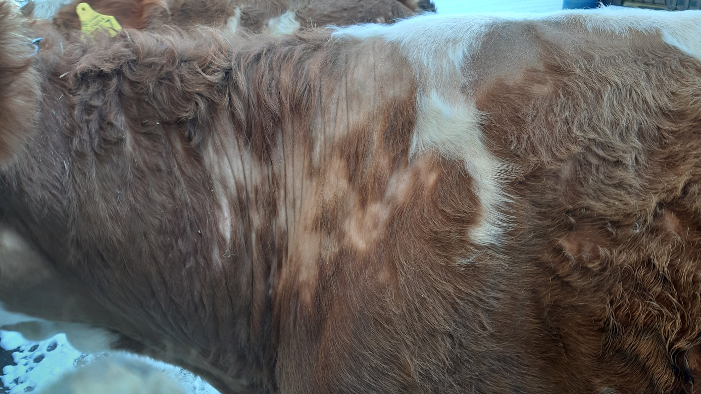 Kann mir jemand sagen, woran das liegen könnte, daß die Haare so großflächig ausgehen? Es ist eine Kuh so schlimm betroffen, bei den anderen gehts. Sie sind fast jeden Tag draußen, am Lichtmangel kanns also nicht liegen. Fütterung: Heu, ca. 1-2 kg rohe Kartoffeln/Tag, etwas Gerste, Mineral. Keine Silage.