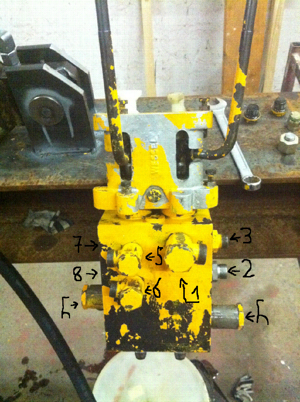 Ich weiß dass die Druckversorgung auf Anschluss 1 kommt. Ich denke mal an das komische h (was ich vorher noch nie gesehen hab) kommt der abfluss zum tank?. ich hatte 5 (rausfahren) und 6 (reinfahren) an den zylinder angeschlossen und das ging garnicht so richtig, der motor vom aggregat lief heiß und man konnte den zylinder nur ausfahren wenn man den rechten hebel in der vorderen stellung nach unten und den linken nach unten...