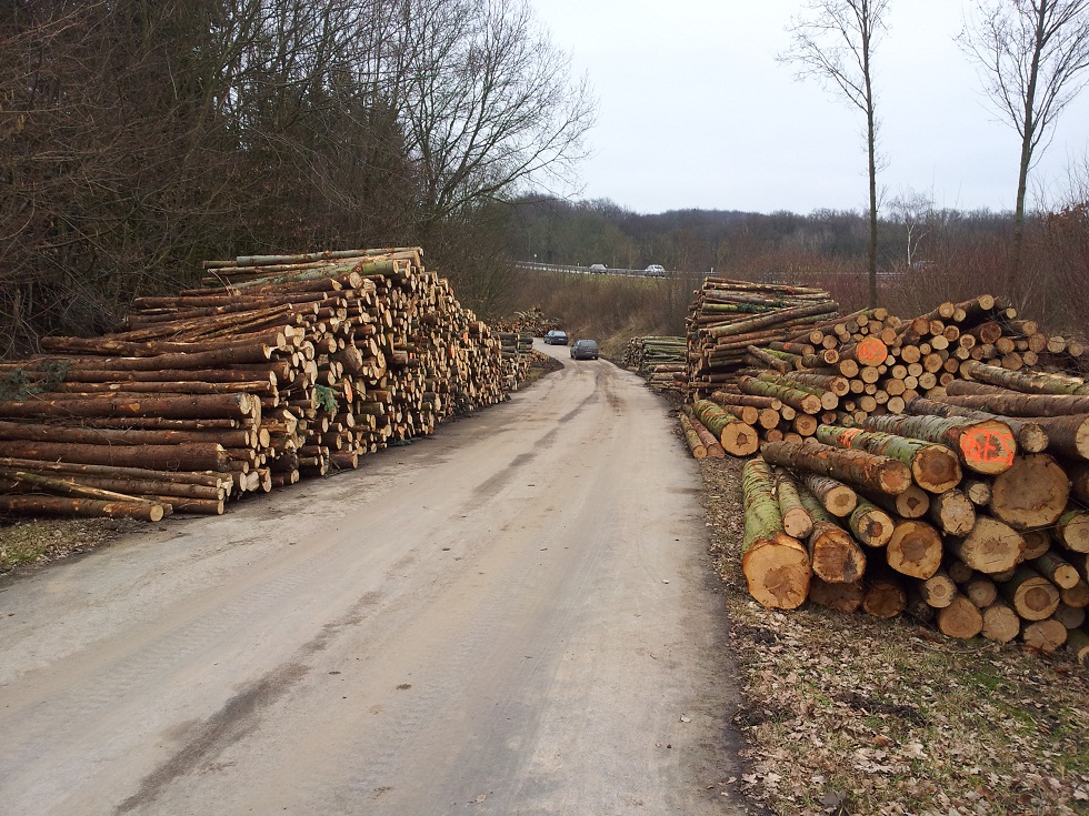 Als Endergebniss liegen jetzt etwa 380 Raummeter (nicht Fetsmeter) grob übergemessen abholbereit am Wegesrand. Die Stämme haben Durchmesser von 10 cm-40 cm, der Großteil liegt bei 20-25 cm Durchmesser. Etwa 70 Prozent der Stämme wurden auf 3 Meter Länge geschnitten, der Rest auf 5 Meter.