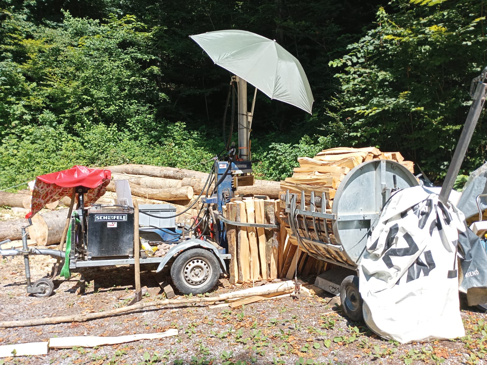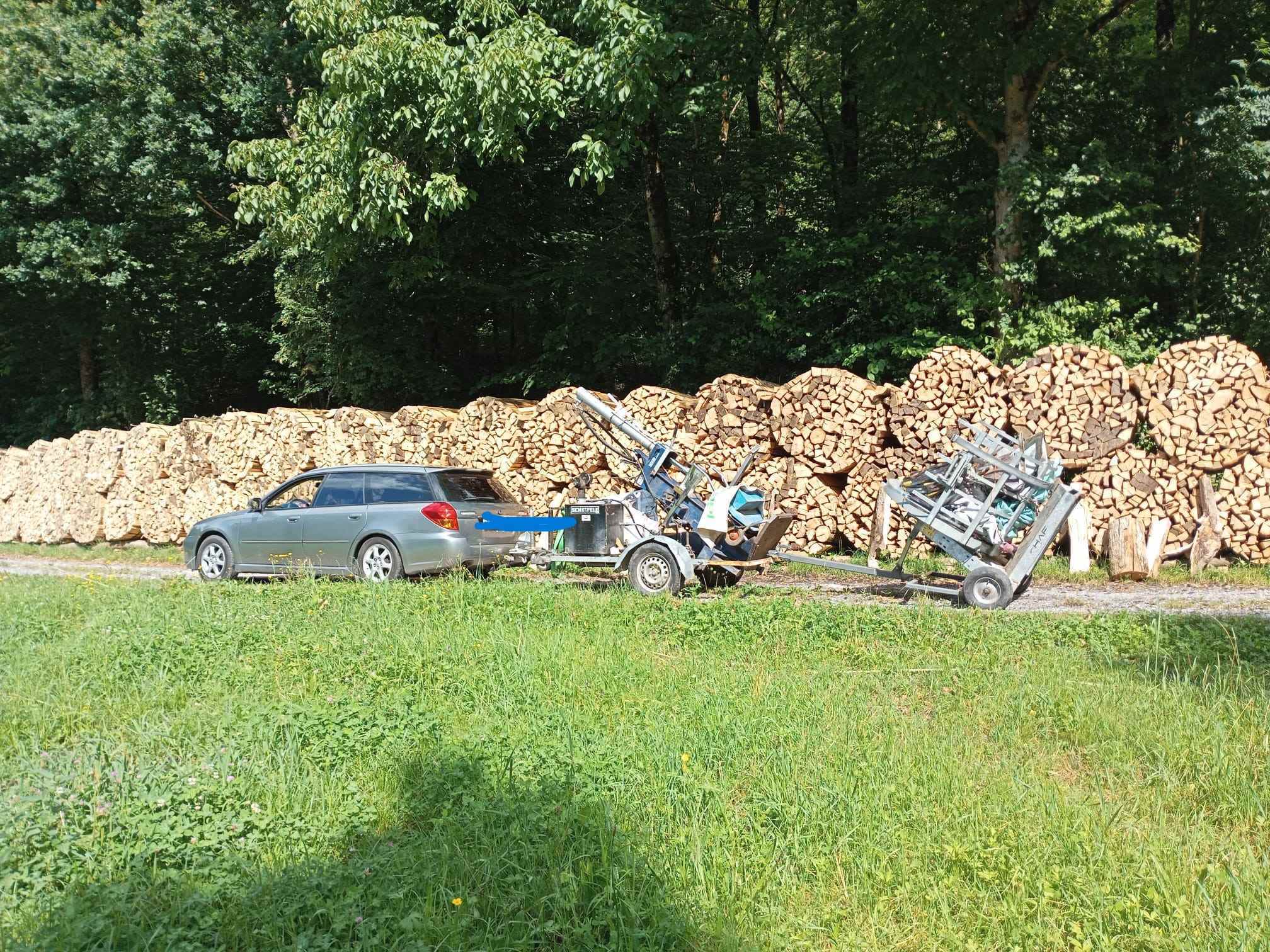 Dazu wäre es gut, wenn dieses mobil wäre. Zum einen, um vom Unterstand circa 50 Meter zum Holzplatz zu kommen. Zum anderen, um dort das Bündelgerät mit der Hand manövrieren zu können, um Platz für neue Bündel zu schaffen.