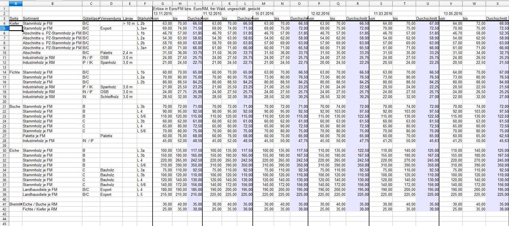 Ich hatte ab Ende 2015 von Zeit zu Zeit diese Holzpreise in eine Excel-Tabelle (Tabellenkalkulation) übertragen und mir jetzt mal angesehen: