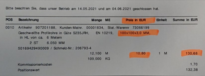 Sturmwind42 hat geschrieben:Ein Stahlrohr in 100/100/3 hat im Juni 2020 11 € netto gekostet , gleiches kostet jetzt 16 € Netto .
