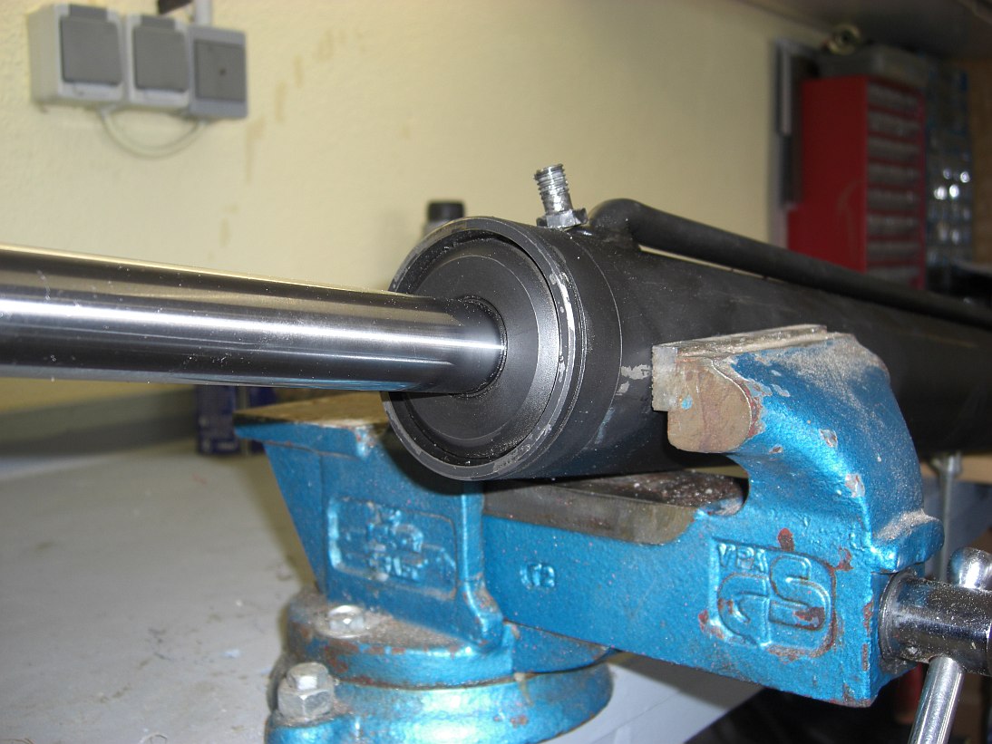 Eventuell hast du so etwas auch in einer der Zylinder-Zuleitungen. Würde auch erklären, dass der Fehler nur beim Ausfahren auftritt. Ich würde anfangen, die Schläuche zu wechseln.Vorher noch den Pumpendruck prüfen. Wenn die Pumpe laut wird könnte die natürlich auch Schuld sein.