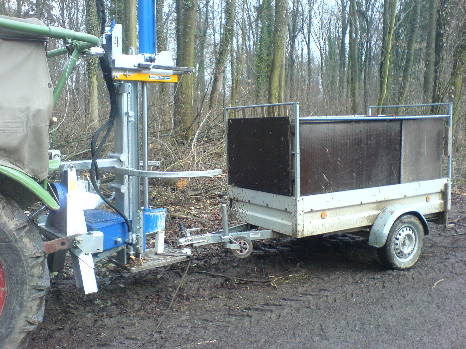 Meine Überlegung ist die folgende: Ich habe nur einen kleinen Schlepper ohne Frontzapfwelle und einen umgebauten Misttreuer als Hänger. Beim Misttreuer geht ja eine Welle bis nach hinten, wo ursprünglich das Streuwerk angebracht war. Da ist jetzt so ein Zapfwellenanschluß. Wenn ich mir hinten einen Art Dreipunkt dranbaue mit einer Art Spindel zum Hochheben(oder Anschluß an die Schlepperhydraulik), könnte ich den Spalter da hinten dranmontieren Spalten und gleich den Wagen beladen. An- und Abbbau des Spalters wäre dann nicht mehr nötig.