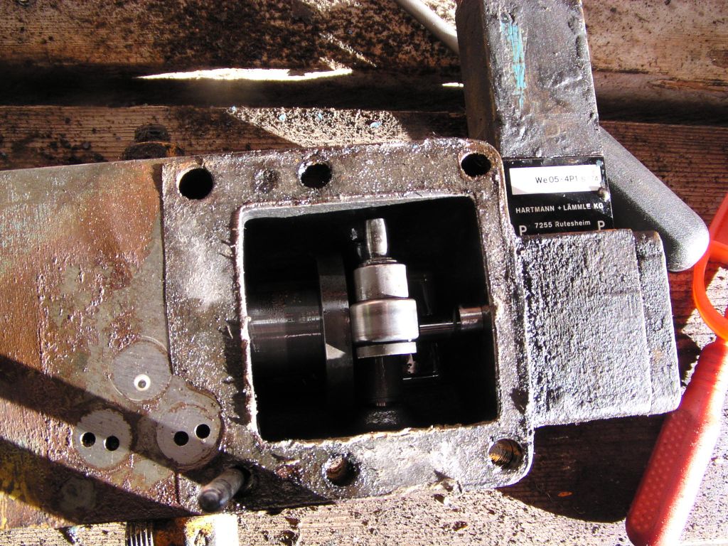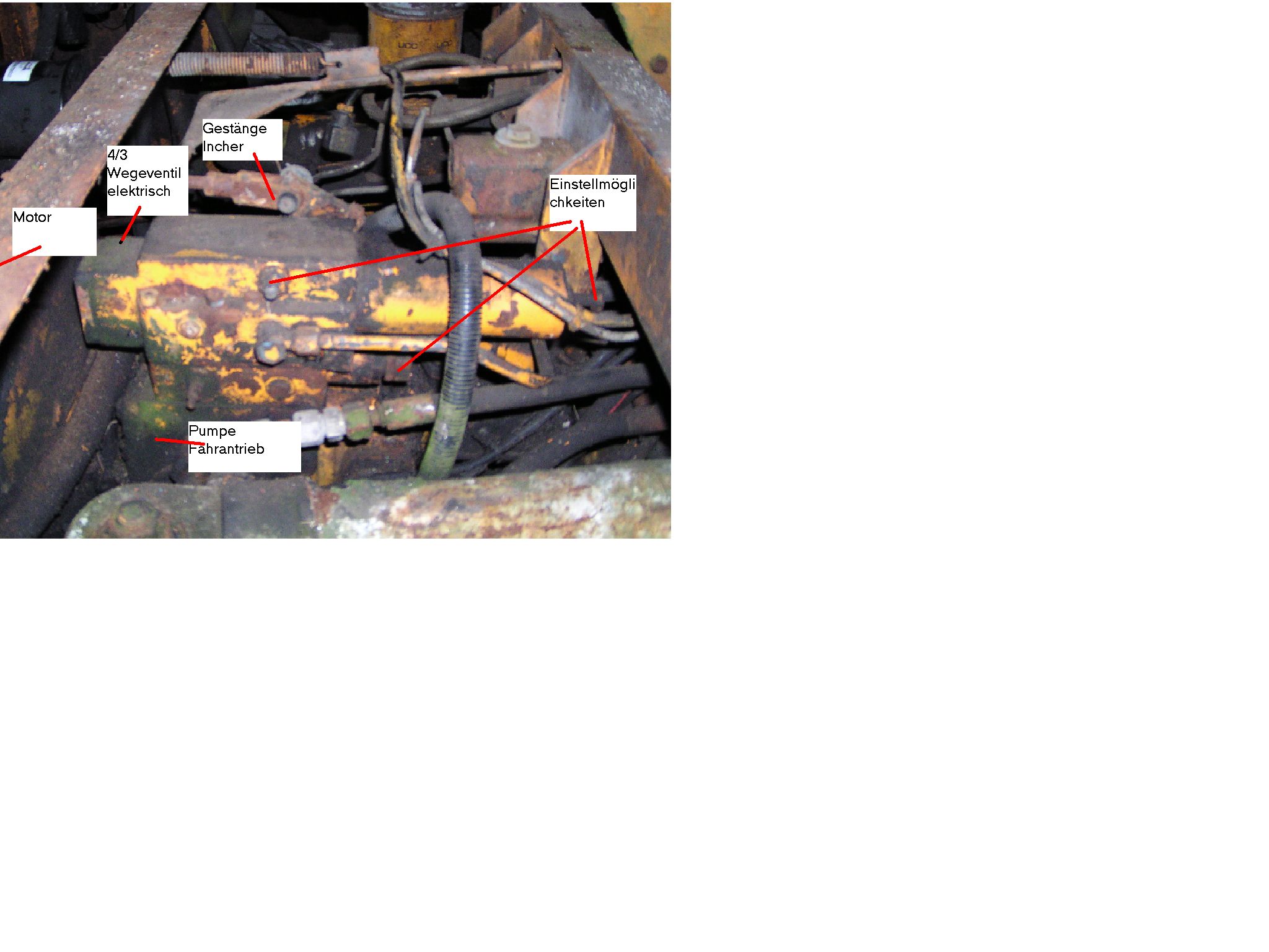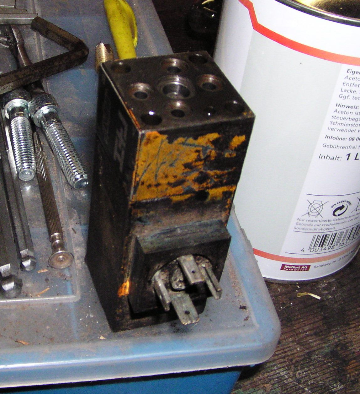 Radlader stand lange Zeit. Motor wieder zum laufen gebracht. Arbeitshydraulik und Lenkhydraulik arbeiten einwandfrei. Für den Fahrantrieb hängt direkt am Motor eine (Radialkolben???)Pumpe die das Öl zu einem Ölmotor am Verteilergetriebe fördert. Am Ölmotor kann elektrohydraulisch die Fahrstufe (Arbeiten/Schnellgang) gewählt werden. An der Pumpe bzw. dem Block drüber sitzt ein elektrisch betätigtes 4/3 -Wegeventil mit dem die Fahrtrichtung umgeschaltet werden soll. (auf dem Foto schon abgebaut). Ist das Ventil eingebaut und nicht betätigt oder in eine der beiden Richtungen betätigt, völlig egal, fährt der Radlader langsam vorwärts los. Auch im Standgas. Es ist kein kriechen, hat richtig Kraft. Blöd ist, habe das Ventil ausgebaut und getestet, es ist völlig i.O. Tritt man den Incher passiert auch irgendwie nichts, dass kann laut Vorbesitzer aber schon lange sein.