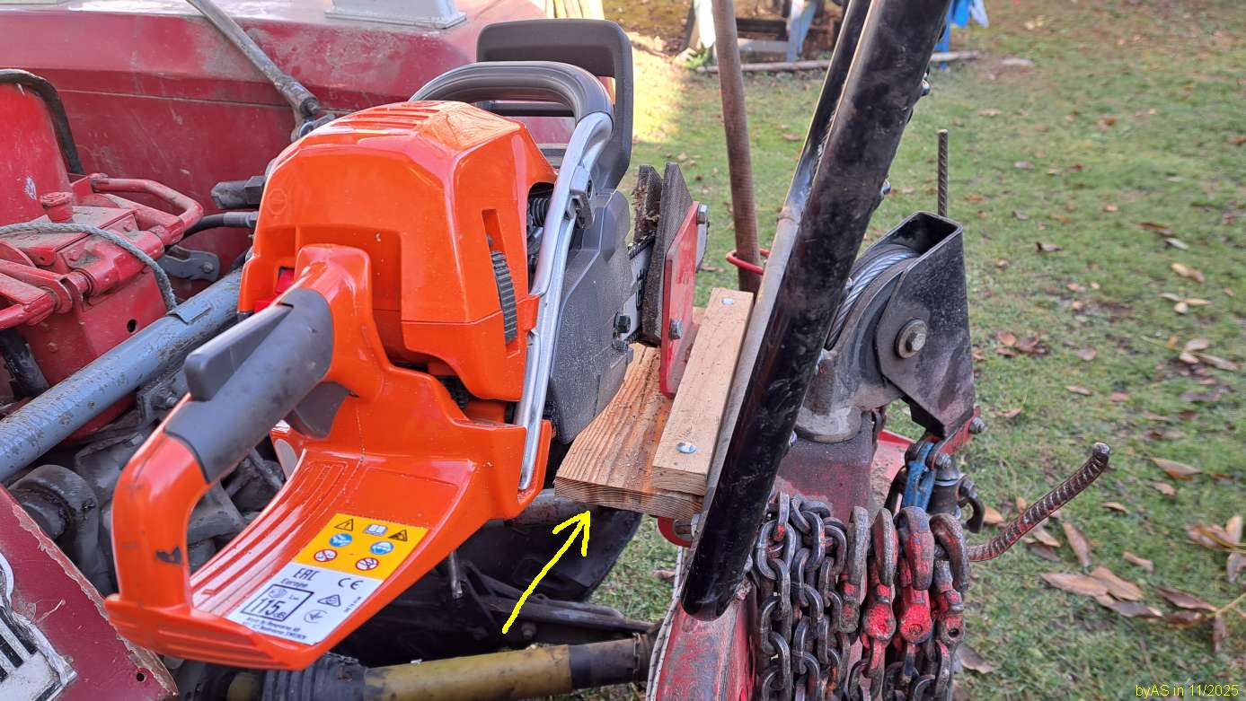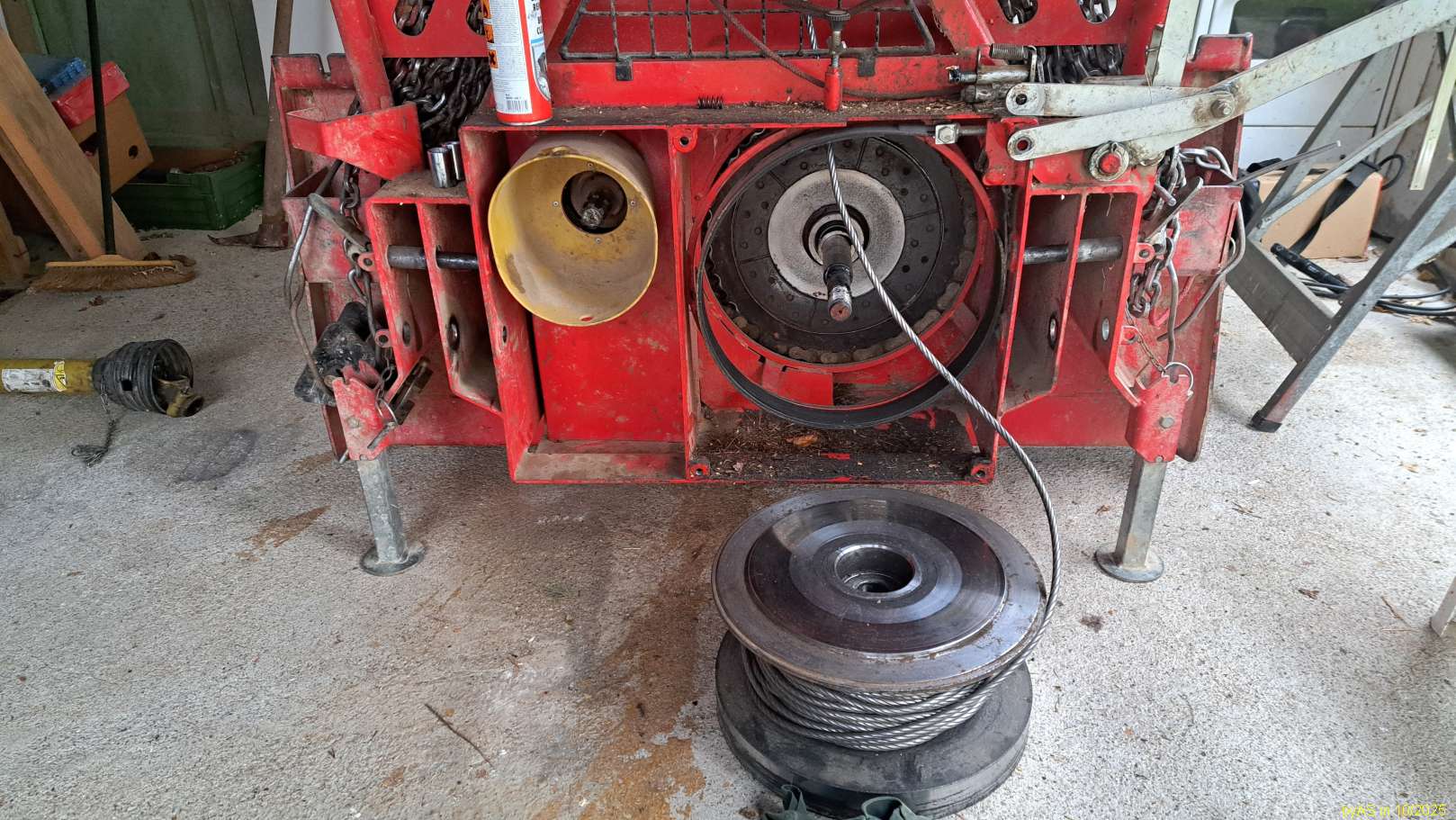 Mithilfe der Traktorzapfwelle das Seil aufspulen. Vor der eigentlichen nächsten Verwendung der Winde sollte das Seil aber bis auf wenige Windungen auf der