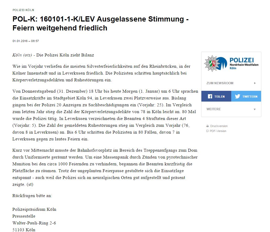Kormoran2 hat geschrieben:Mittlerweile sind sehr viele Kölner Polizisten den Aussagen ihres Chefs entgegengetreten und haben klargestellt, dass die Einsatzleitung vielfach bereits Stunden vor dem Ereignis informiert war über eine gefährliche Zusammenballung von hunderten von überwiegend Nordafrikanern und dass die Leitung auch über Übergriffe ständig unterrichtet wurde.