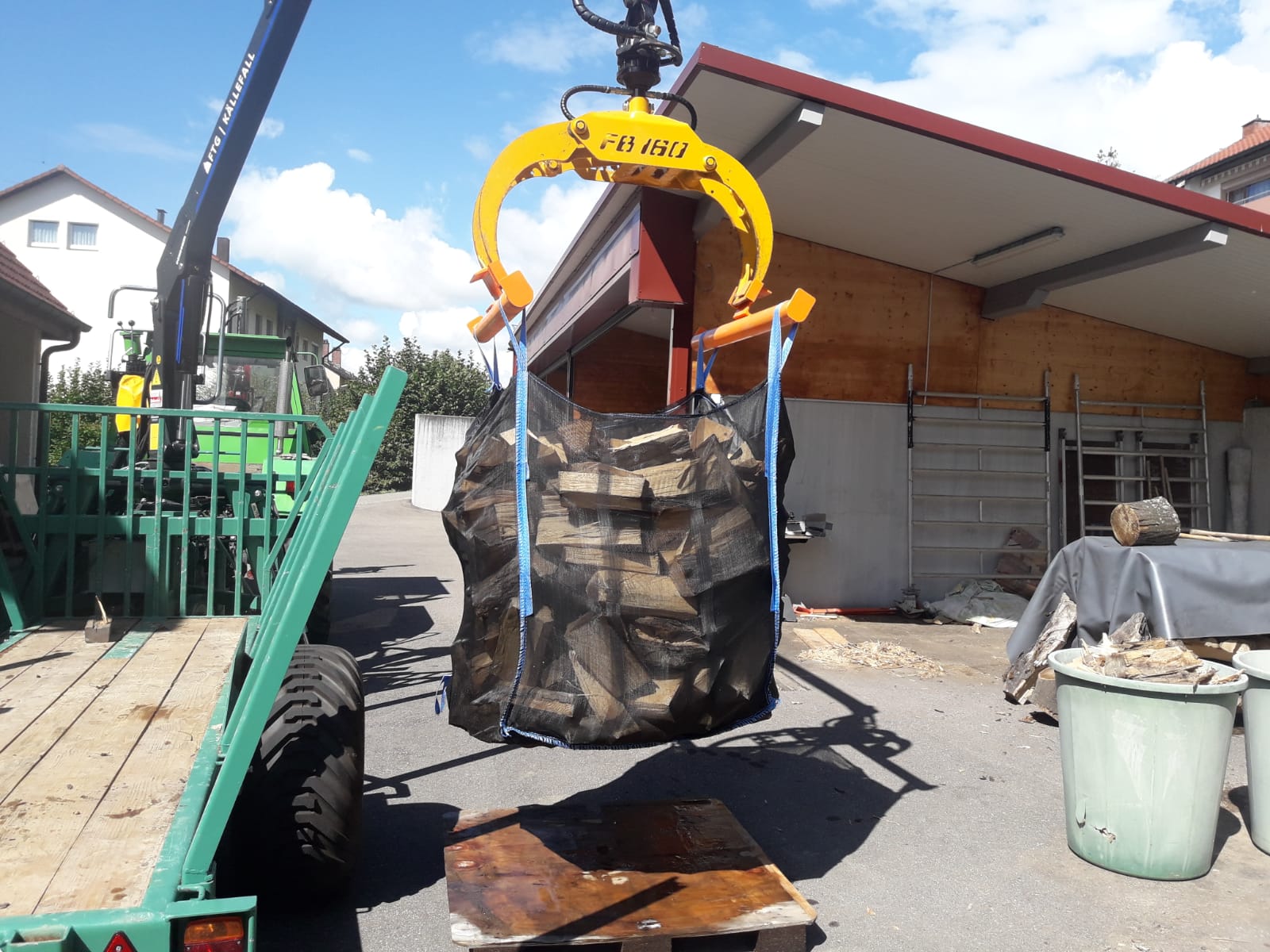 Vorgesehen ist, daß die fertigen Scheite am Ende des Förderbandes in Big Bags (mit Netz-struktur) purzeln, in denen dann das Holz bis zur Auslieferung an die Kunden in einer nach zwei Seiten offenen Lagerhalle trocknen soll.