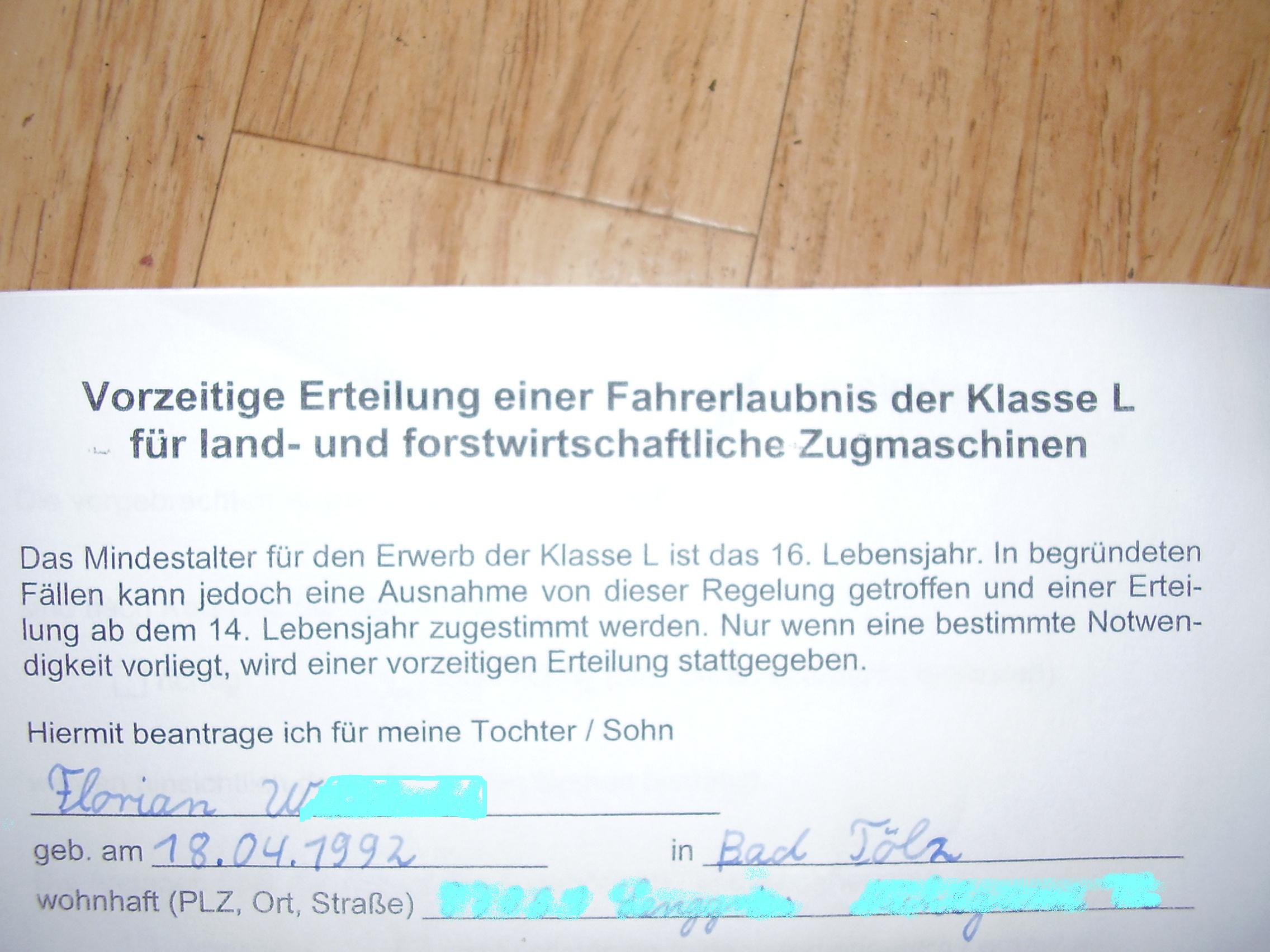 A.L. hat geschrieben:Hallo ich hab da 2 frage und zwar darf man mit antrag traktor fahren wann und wo man will oder nur wenn man einen ''auftrag'' hat mit nem traktor was zu machen? und wie viel kostet den so ein führerschein der klasse L so durchschnittlich komplet