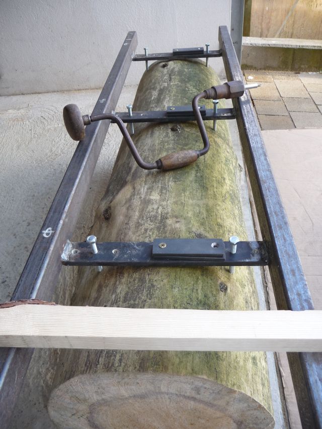 Diese Bilder sind von kurzen Stämmen, werden 45er Abdeckbohlen für eine Montagegrube. Und ein paar Bilder längerer Stämme mit Hilfe einer Leiter gesägt, damals war das Teil noch unlackiert. Eine Kette habe ich auf 15° Winkel als Längsschnittkette umgeschliffen. 40cm Breite ist machbar.