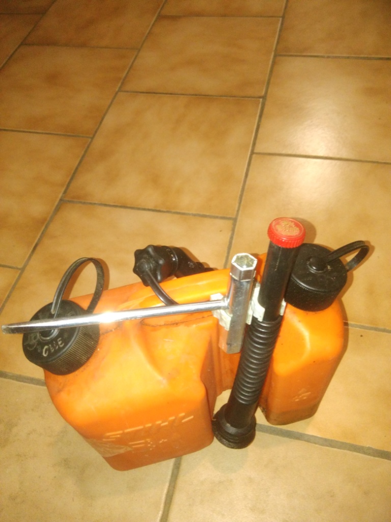 Mir war am Kombikanister damals wichtig, dass er rank und schlank ist - damit er vor der Motorsäge neben dem Schwert in der engen Motorsägentransportkiste Platz hat.
