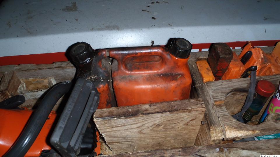 Da ich sowieso immer viel Krempel (Keile, Schärfzubehör, Helm, und und und) mit in den Wald schleppe, kommt es bei mir nicht auf einen Kanister mehr an. Habe mir das schön in einer IFCO-Box organisiert, die dann entweder in den Kofferraum oder Schlepper kommt.