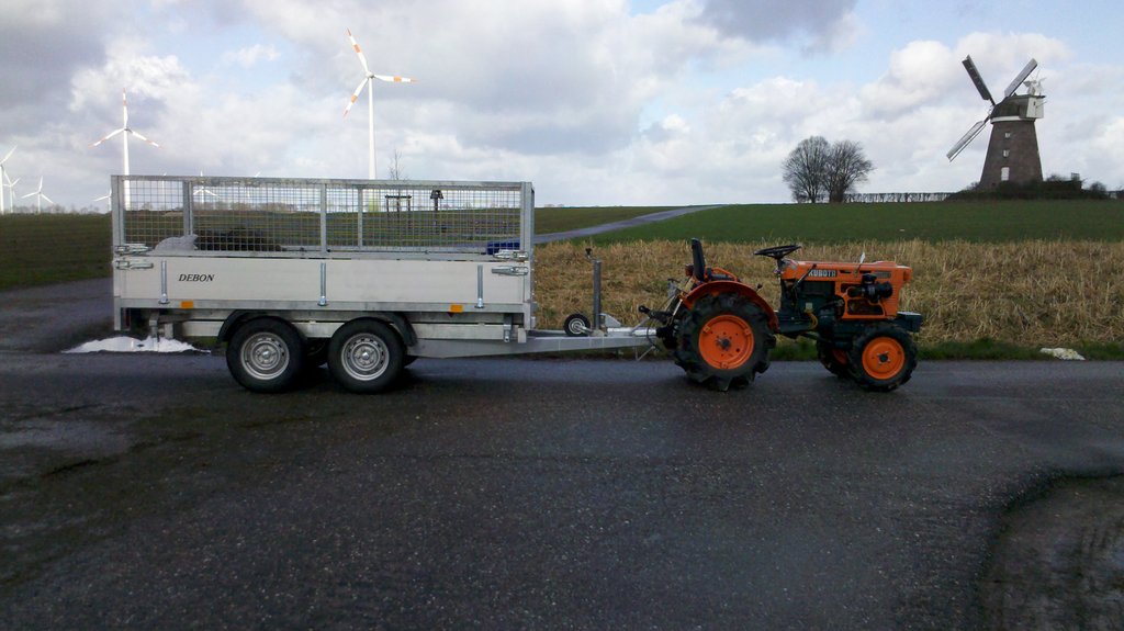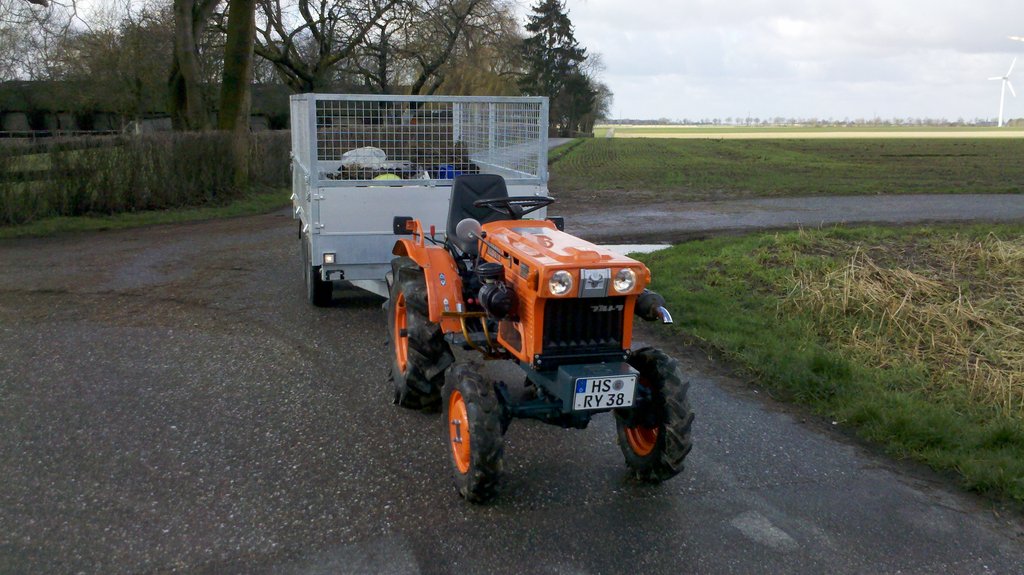Aber jetzt zurück zum Thema, wie habe ich es gemacht. Da ich so etwas schon geahnt habe mit dem festen TÜV, habe ich mich an meinen Händler gewandt, der mir den kleinen Yanmar verkauft hat. Er hat mir gesagt was ich an Beleuchtungseinrichtungen nachrüsten muss. Dabei war ein Bremslicht nicht erforderlich. Habe dann alles angebaut, zzgl. Bremslicht und Rückspiegel. Traktor auf den Hänger verfrachtet und zu dem 100 km entfernten Händler gefahren. Dort kam dann eine Außendienstmitarbeiterin vom TÜV. Man ist um den Traktor herumgelaufen, hat sich den Reifentyp angesehen, Maße genommen und dies alles mit dem Datenblatt vom Hersteller verglichen. Irgendwann kam der Händler nochmal raus und hat gefragt ob die Hupe geht und gut war. Danach konnte ich den Traktor wieder auf den Hänger stellen und bekam ein TÜV Gutachten und eine TÜV-Bescheinigung (2 Jahre TÜV), Fahrzeug ohne Mängel.