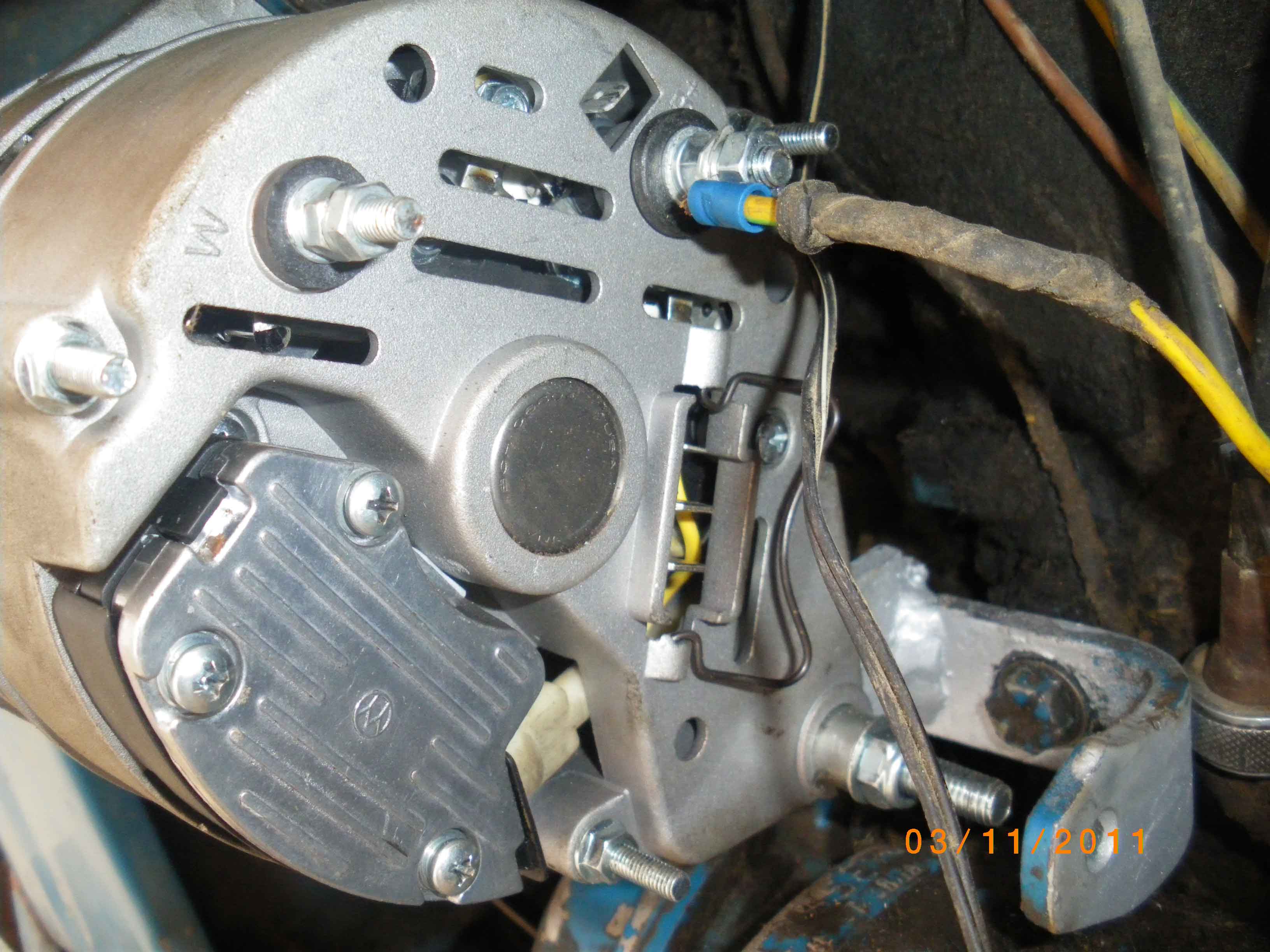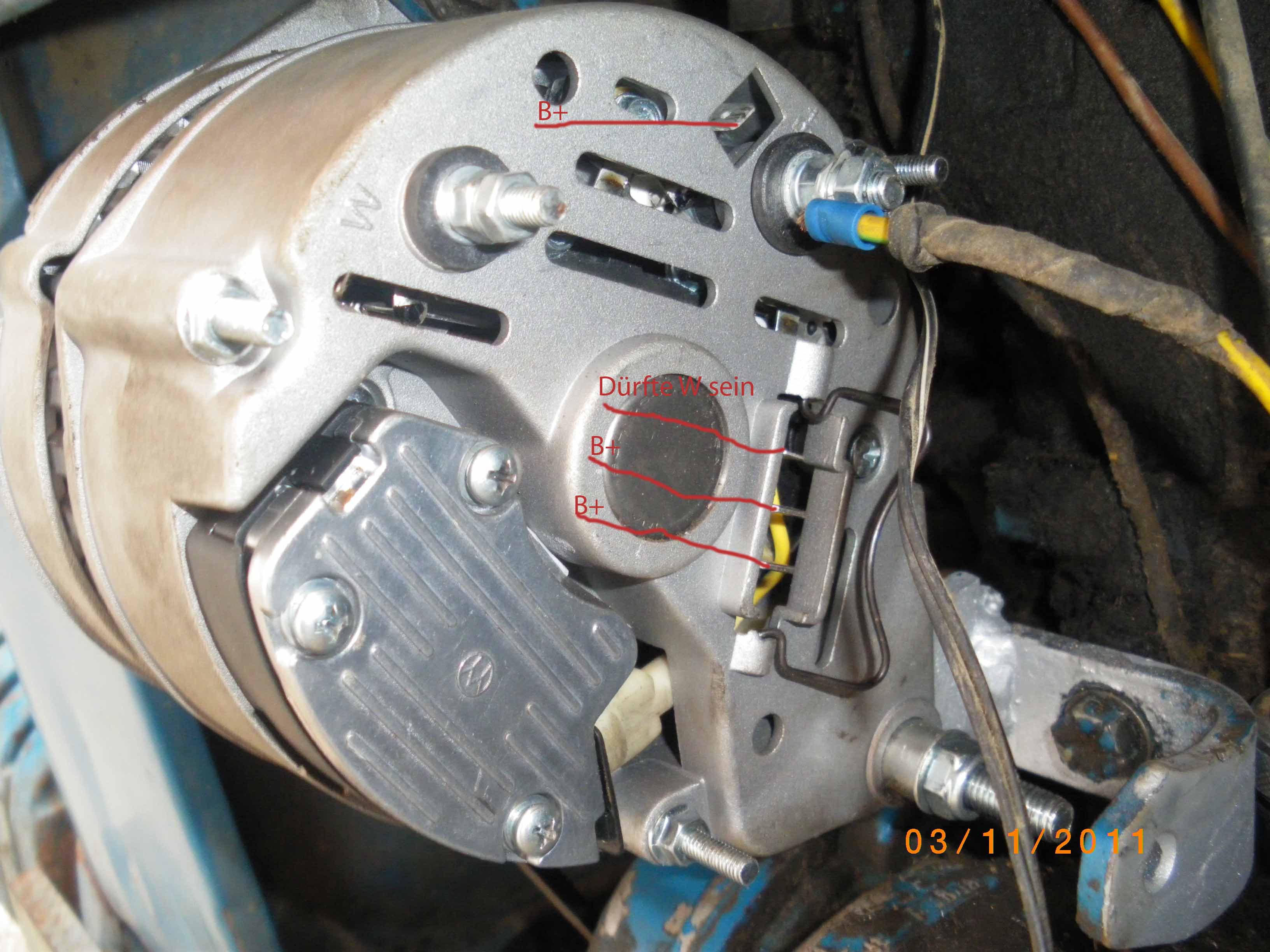 Anschluss B+ zur Batterie W zur Ladekontrollleuchte soweit ich gemessen habe wird die Batterie geladen bei laufenden Motor so ca. 14 Volt bei Anschluss W bei eingeschalteter Zündung ca. 1,5 Volt bei laufen enden Motor so ca.7 Volt ist das zu wenig? Erlischt darum die Kontrollleuchte nicht.