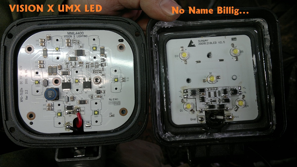 Die günstigen Scheinwerfer mit den extremen Lumenangaben sind meiner Meinung nach zu Stark von der Leistung ausgereitzt was sich später auf die mangelde Kühlung und dann sicherlich auch auf die Lebensdauer auswirkt. Im TEst hätten die Scheinwerfer mehr nach gleichen Leistungen verglichen werden müssen, die Spannen liegen ja zw 24 und 60 Watt
