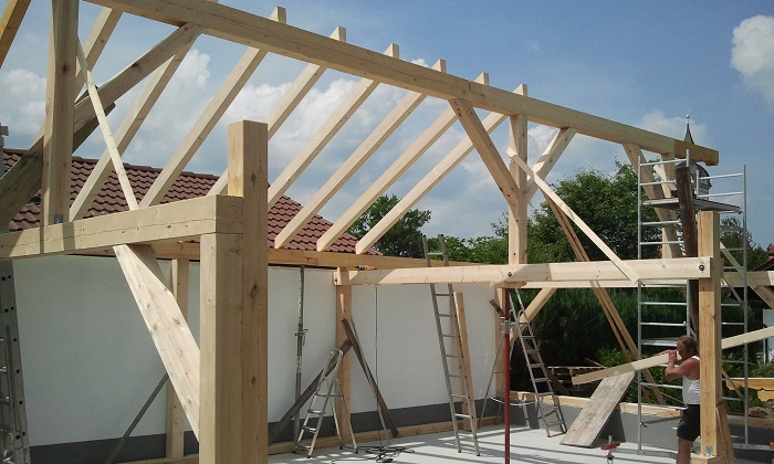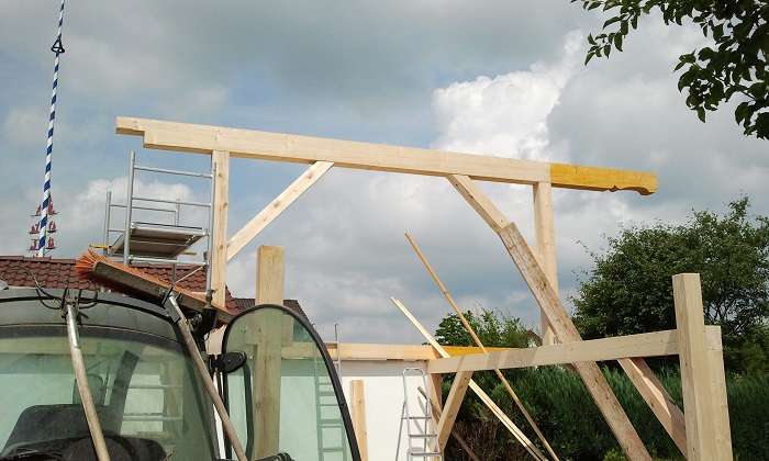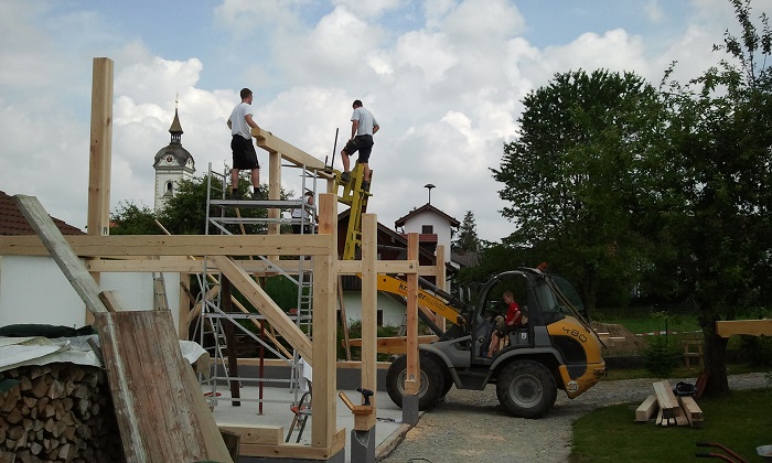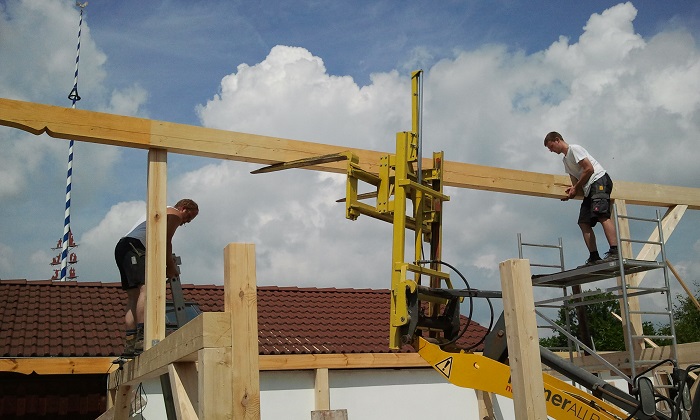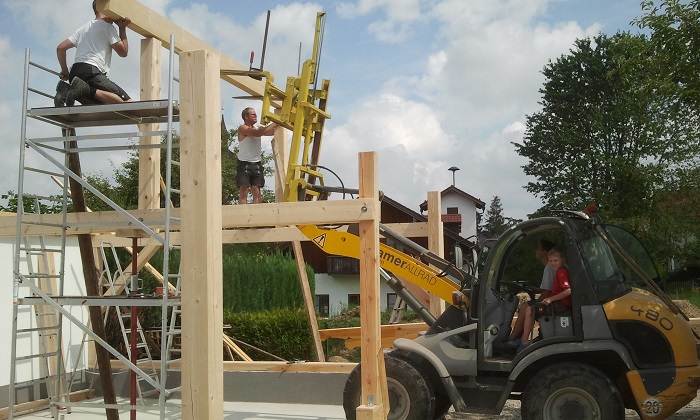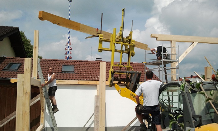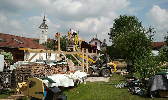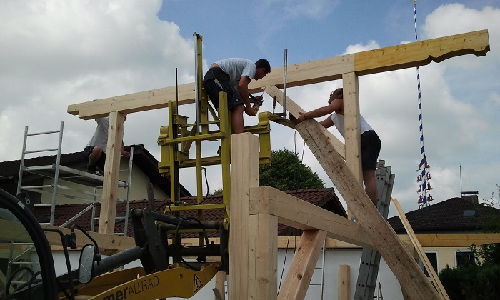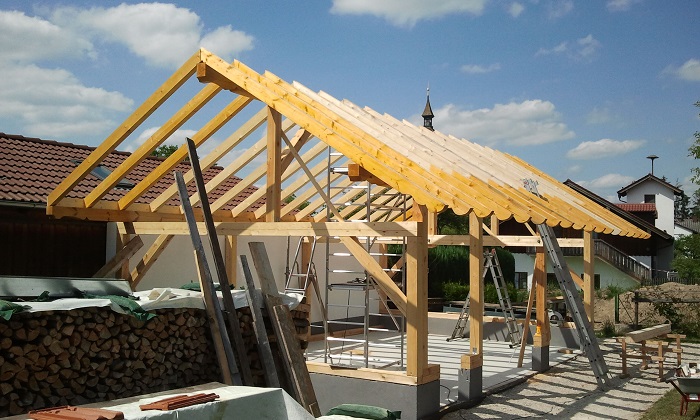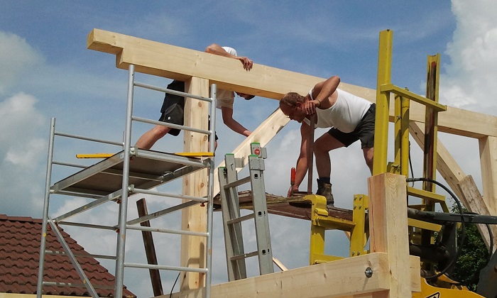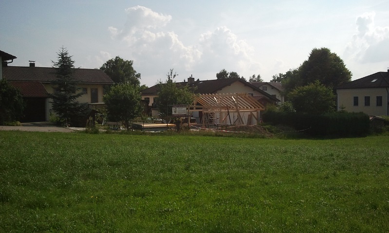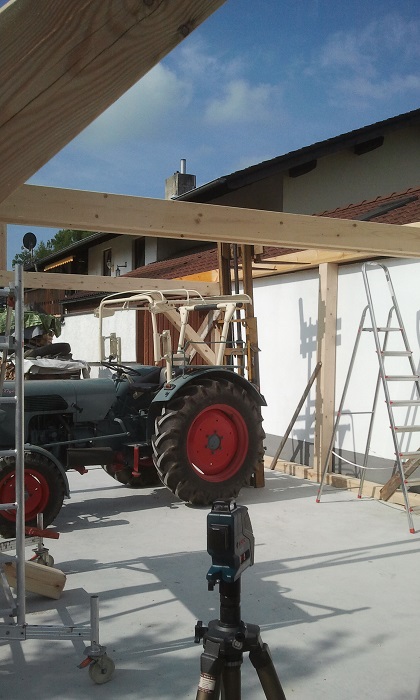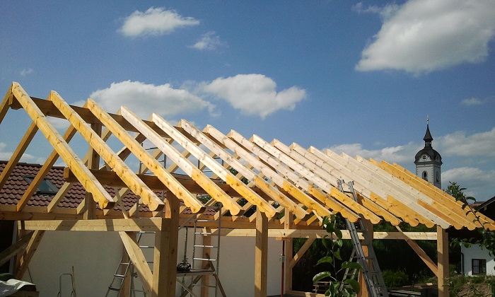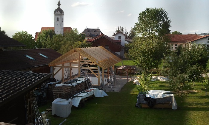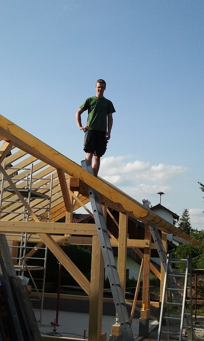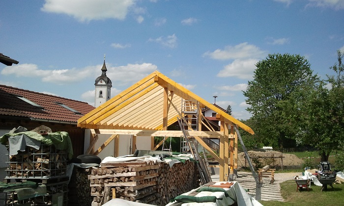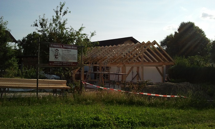 Wenn zumindest die Rückseite des Daches eingeschalt ist, damit der Spengler die Dachrinne und Abdichtbleche einbauen kann.