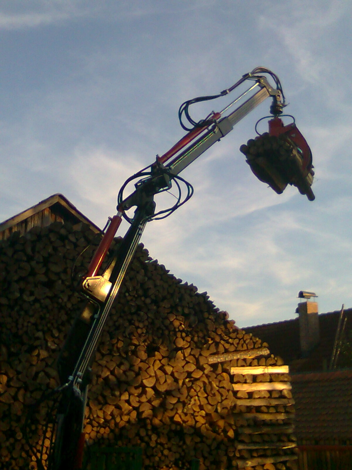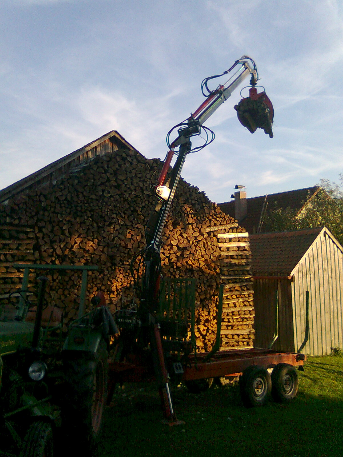 Momentan bin ich dabei, den Kran zu restaurieren. Zwei Zylinder haben neue Kolbenstangen bekommen und wurden abgedichtet und er hat neue Schläuche bekommen. Zudem wurde er lackiert. Achja, antreiben wollte ich den Kran mit der Hydraulik von unseren JD 6200.