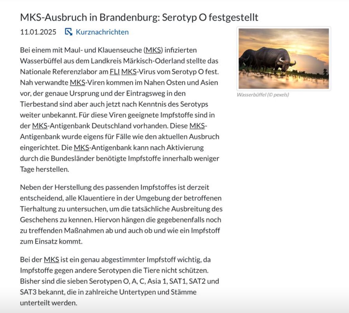 Mindestens drei Wochen waren die bereits getöteten Wasserbüffel in Hönow mit der Maul- und Klauenseuche infiziert. Das bestätigte Dr. Ralph Bötticher, Leiter des Veterinär- und Lebensmittelüberwachungsamts MOL, in Seelow auf Nachfrage. Nun werden Proben untersucht, um den Virenursprung zu identifizieren.