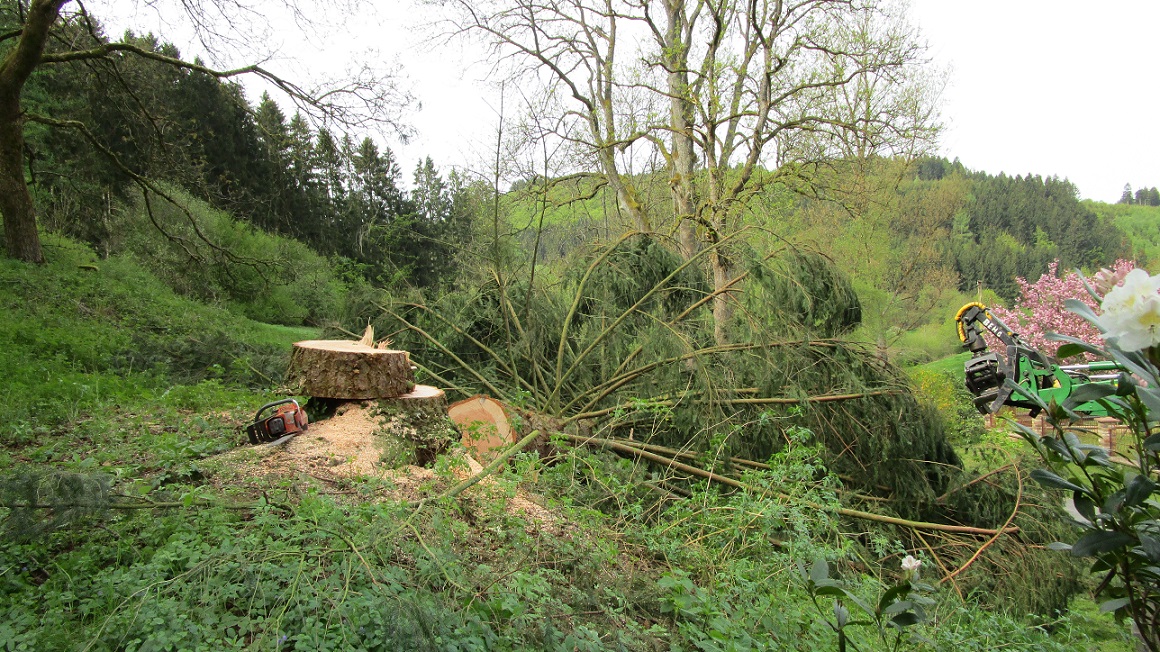 Die Douglasie vor unserem Haus wurde von meinem Schwiegervater gepflanzt. Ich weiß genau, dass das für ihn keine Nutzpflanze sein sollte sondern einfach zur Erbauung gedacht war. Aber keinesfalls sollte sie das Haus irgendwann gefährden. Auch er hätte sie also schweren Herzens fällen lassen. Außerdem stehen noch weitere große Bäume in Hausnähe, jedoch nicht so nahe, dass sie das Haus gefährden könnten. Es wird also ums Haus herum keine Wüste entstehen.