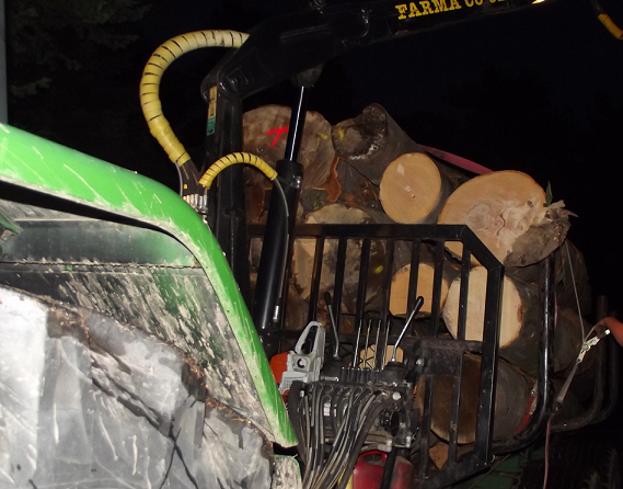 John Deere 3640 mit Farma 12 Tonner und 6,5 Meter Kran MF133 mit Palax Logger Säge BGU 22 HZ Stehendspalter IHC 644 mit BGU Spaltgigant 30 HZ Liegendspalter (Binderberger) Uniforest Phyton Palax Power Sägespaltautomat