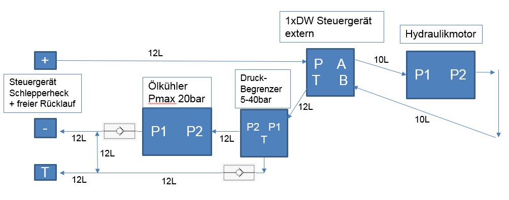 Deshalb möchte ich einen Ölkühler (Pmax 20bar, 70L, 12V) einbauen. Derzeit wird einfach ein DW-Hecksteuergerät vom Schlepper verwendet und auf Dauerdruck gestellt, welches dann das externe Steuergerät am Fass bedient. Dieses steuert über einen Ausgang den Abscheidermotor an, der andere Ausgang ist dicht.