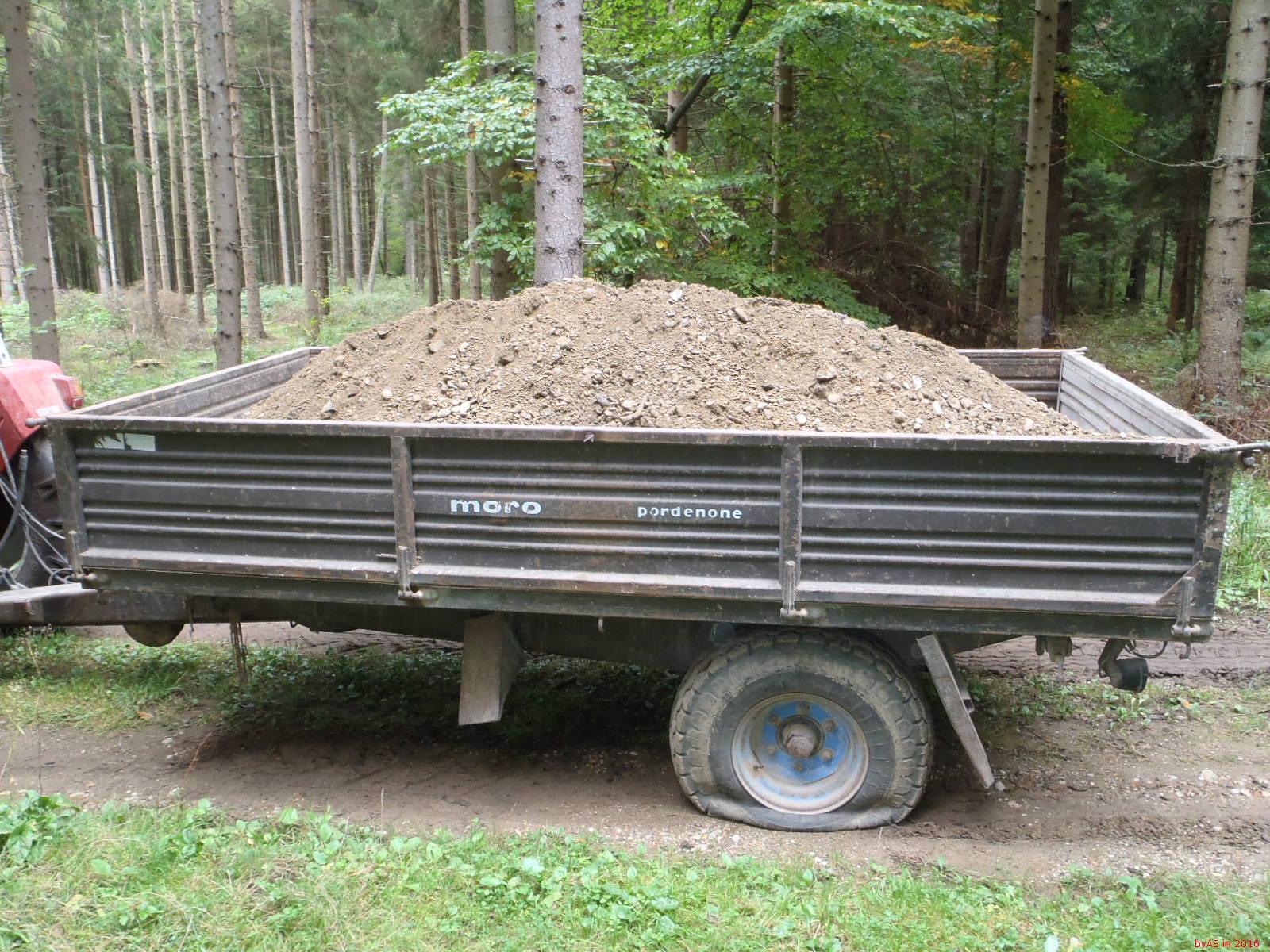 Schotter abgekippt, Zweittraktor mit Heckkiste geholt, und den Schotter so verteilt.