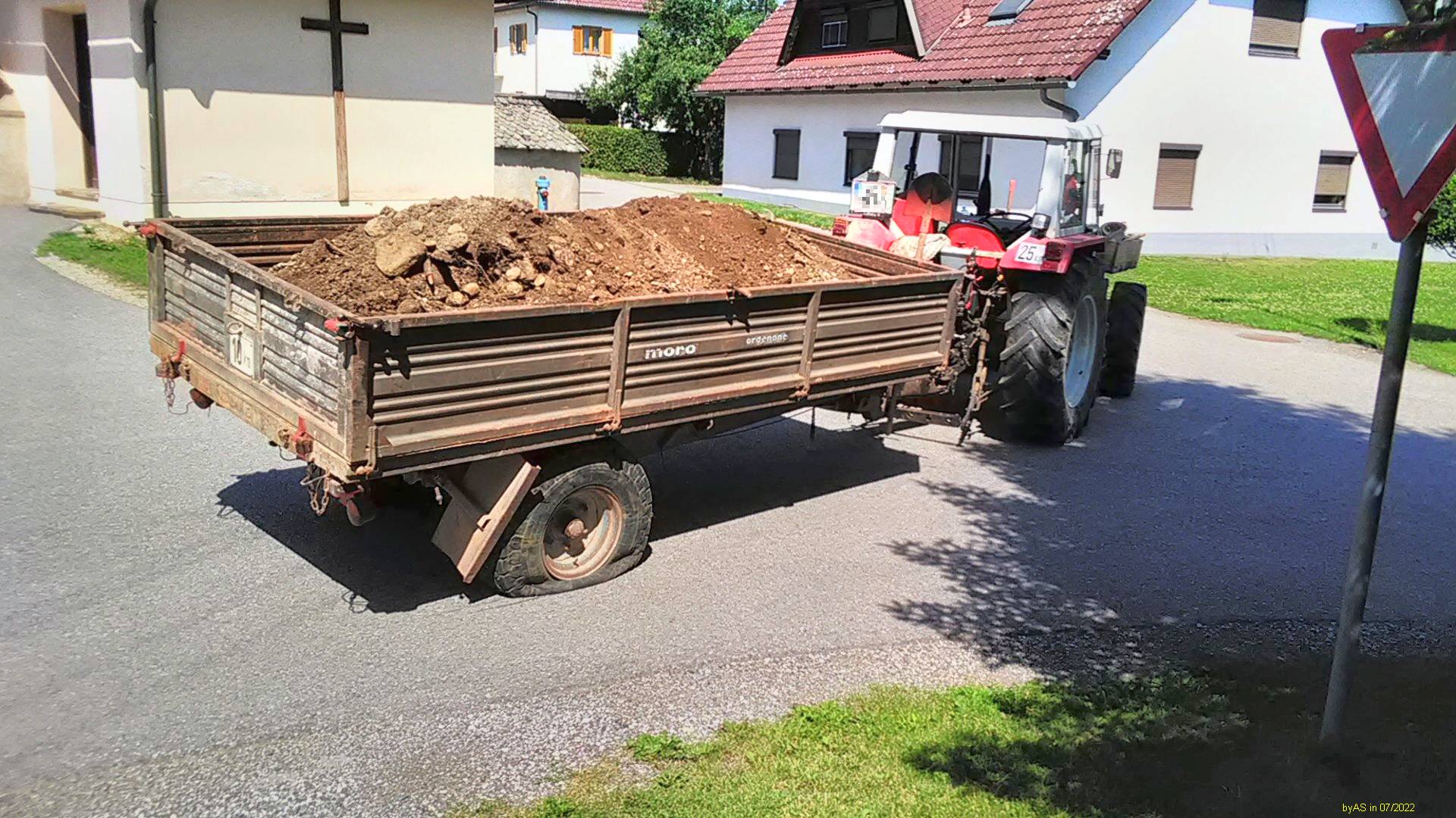 Bei der Wegpflege verteile ich das Material (hier erdiger Aushub-Schotter) ja üblicherweise direkt vom Kipper mit der Schaufel in die Fahrrinnen der Wege - weil das mehr Meter macht.