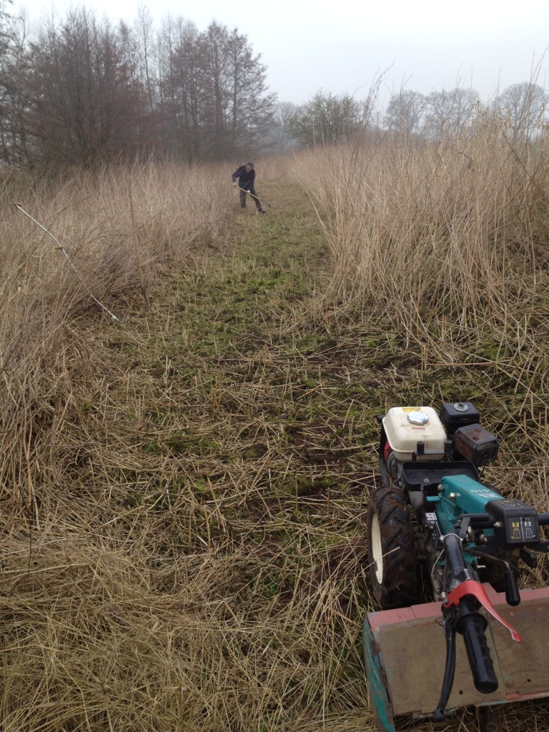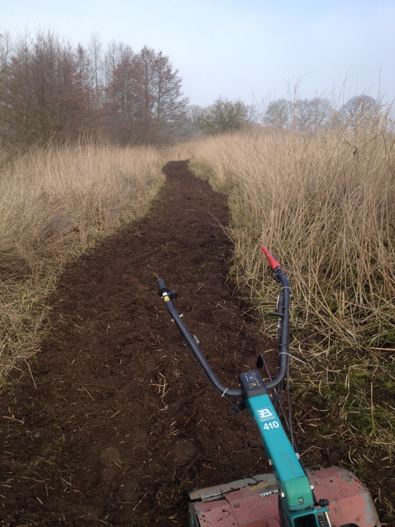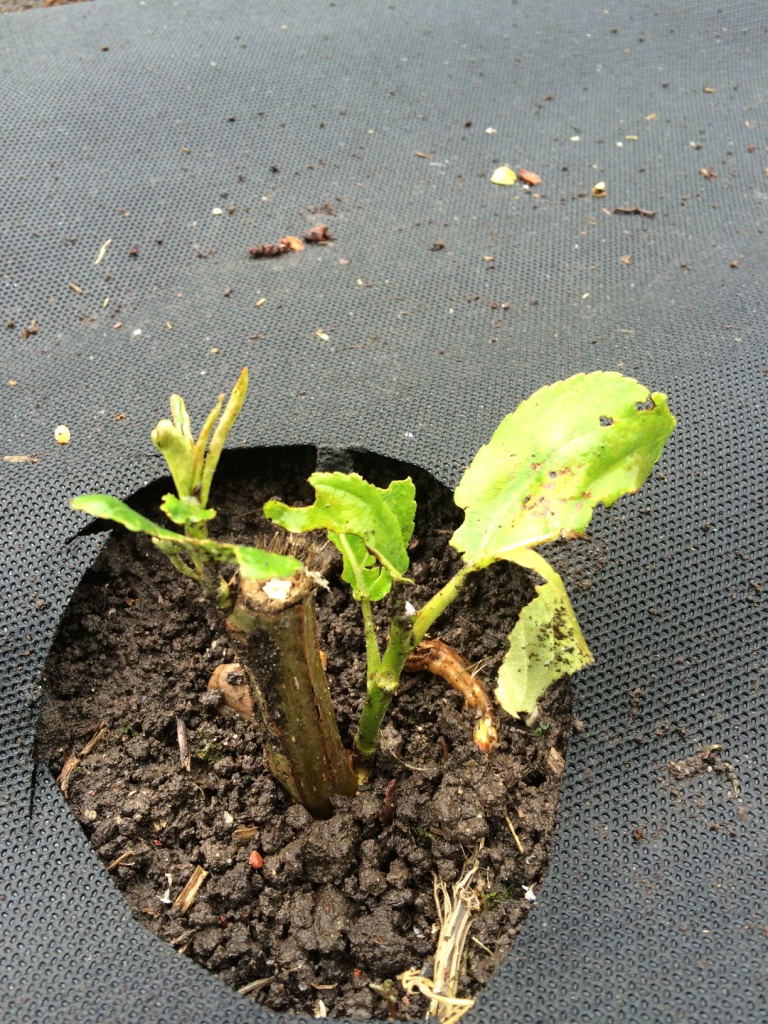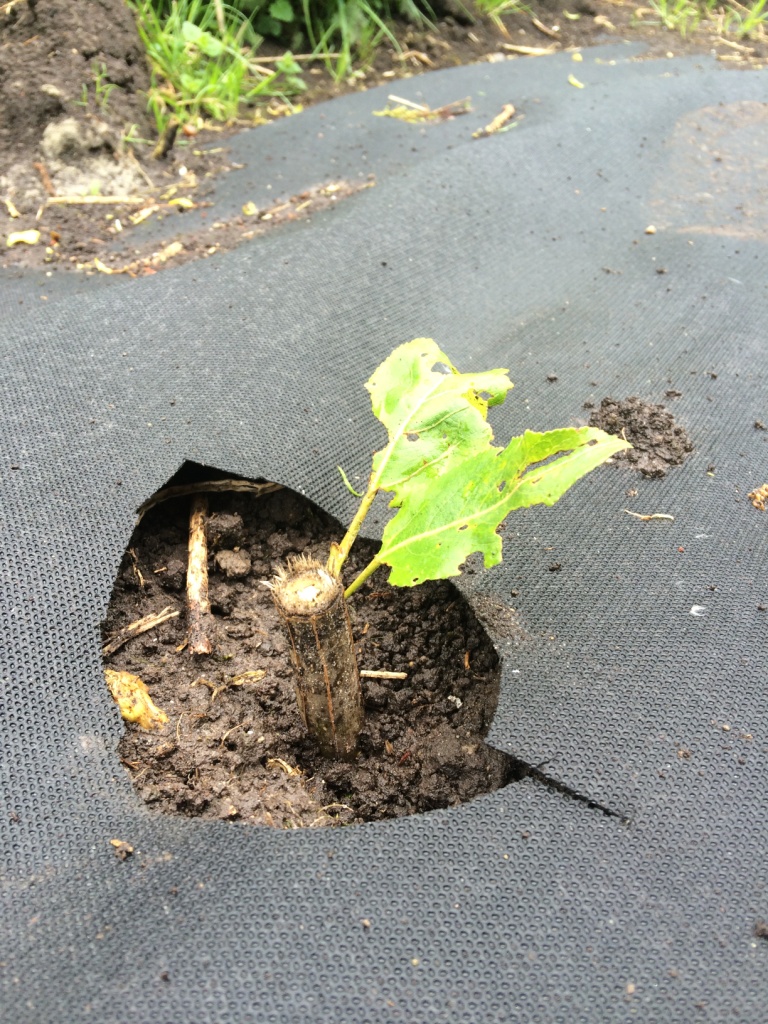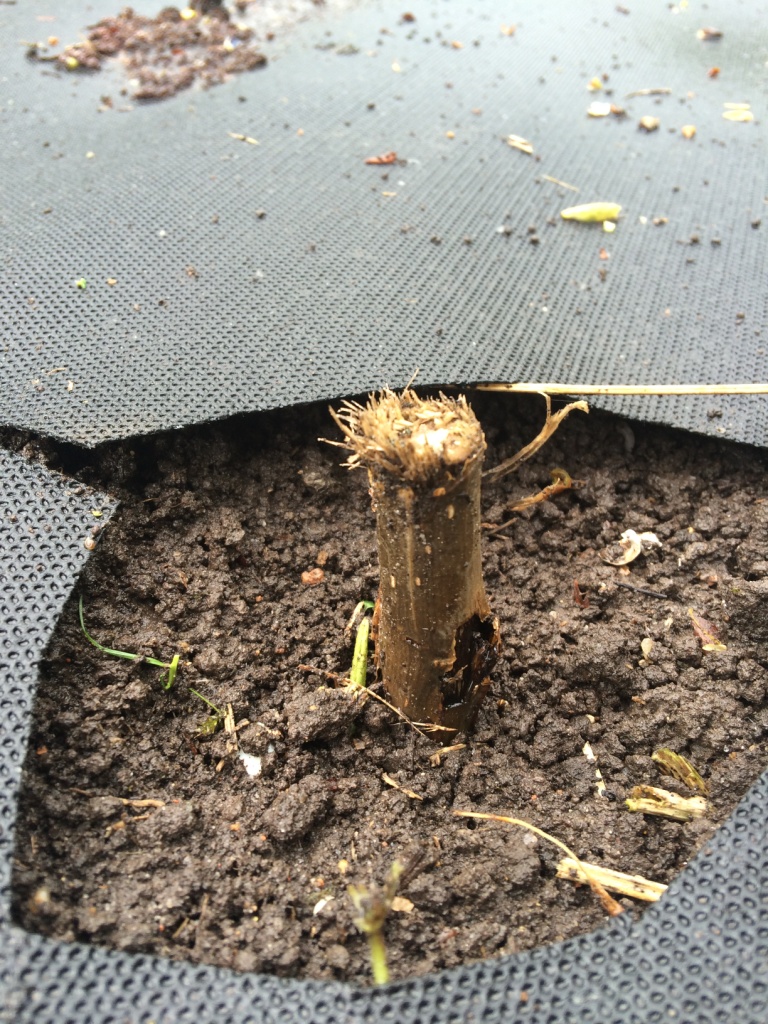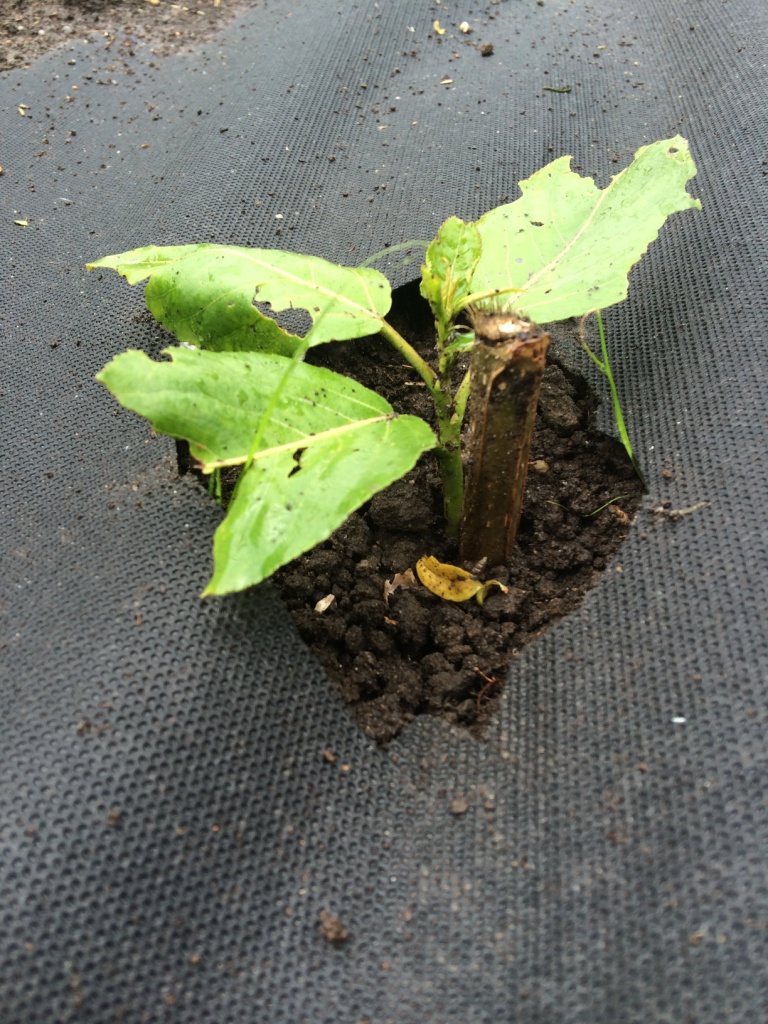 Ich habe eine kleine Versuchspflanzung mit Pappelhybriden (Matrix 49) auf einem ungenutzten Stück Land gemacht. Da die Fläche sehr stark mit Brennesseln bewachsen ist, habe ich den Boden zunächst mit einer Fräse bearbeitet, dann Unkrautvlies ausgelegt und Löcher für die Stecklinge reingeschnitten. Gesteckt habe ich die Hölzer am 14.März 2014 und anschließend noch etwas Rehtulit gestreut.