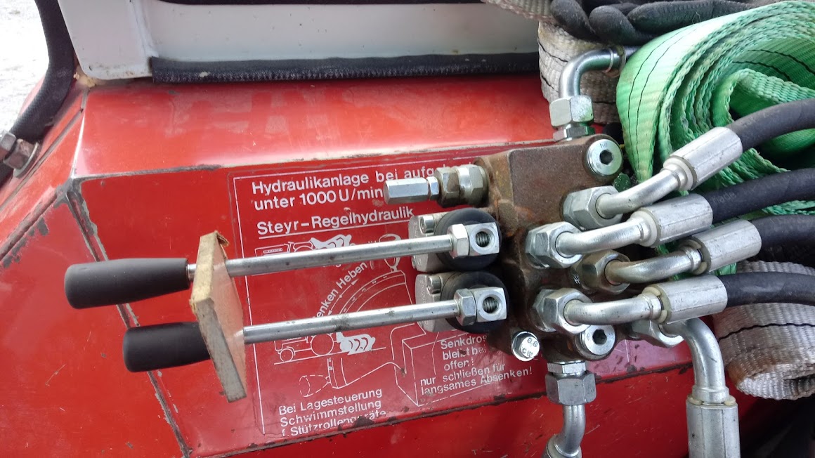 Auf dem gestrigen Foto ist noch kein Schockventil dabei. Das ist jetzt auch am Ölmotor drauf. Das Holzplattl dient als Fixierung für den Hydraulikhebel. Kupplungshebel für Seilwinde wird mit verlängerter Schnur betätigt. Ebenso die klinkensperre.