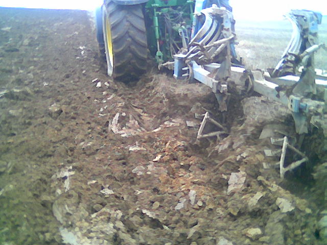 Schon mal nen 650er Reifen gemessen? Ein 650/65 R 38 ist ca 60 cm breit. Außerdem steht der Reifen in der Furche schräg und läuft teilweise an und auf der Furchenwand. Maximal werden 12 cm im gepflügten Bereich festgefahren, die aber vom ersten Schar wieder mit Erdreich zugedeckt werden. Im Bereich direkt neben der Furche liegt ja ohnehin nur wenig Erde.