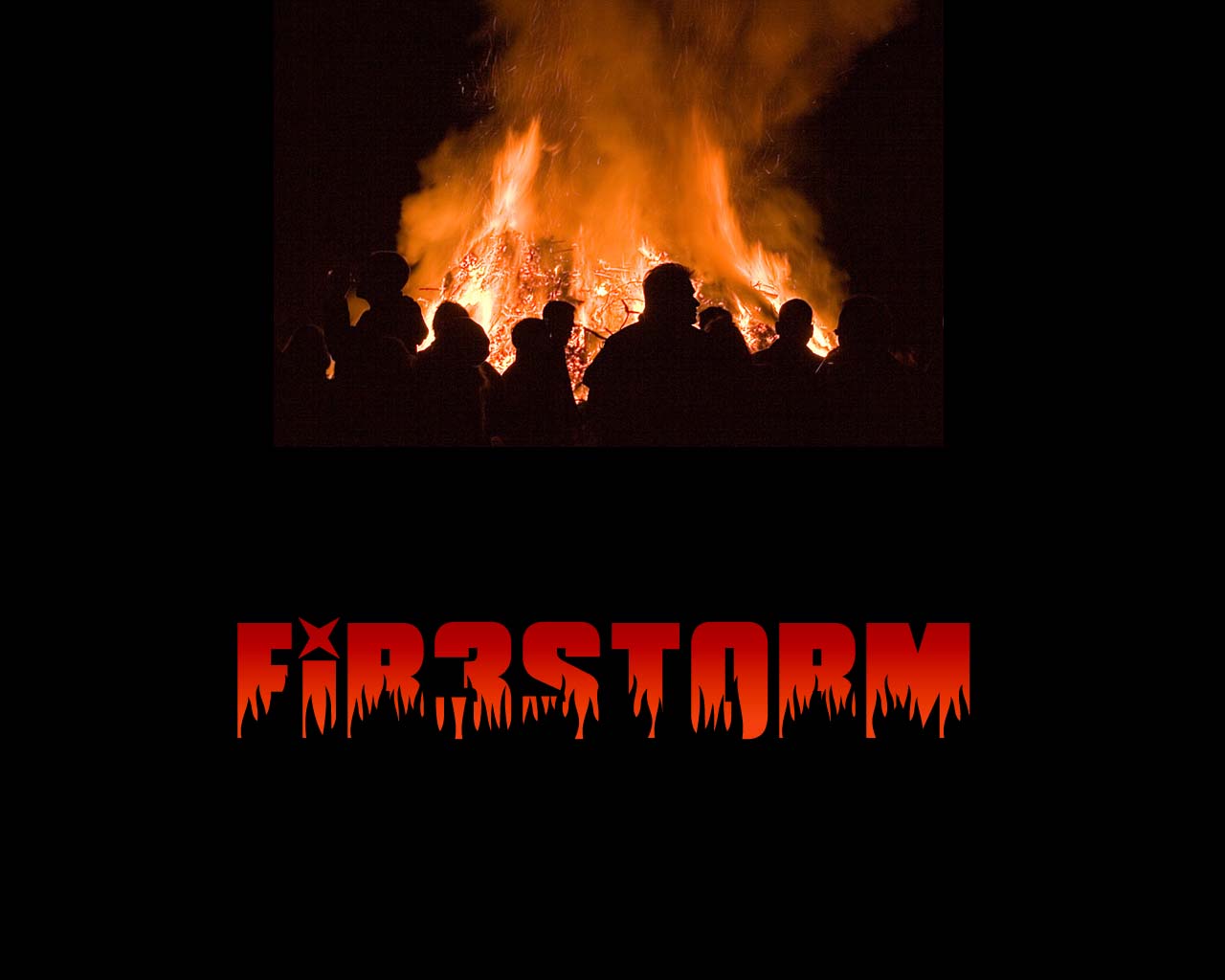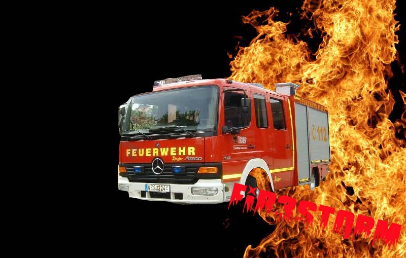 schwarzer hintergrund, feuer auf der linken bzw rechten seite, aus dem feuer kommt ein großes feuerwehrauto (wird immer blasser im feuer).