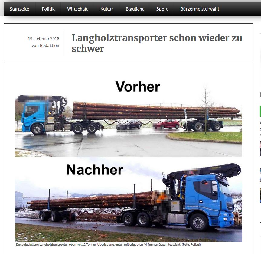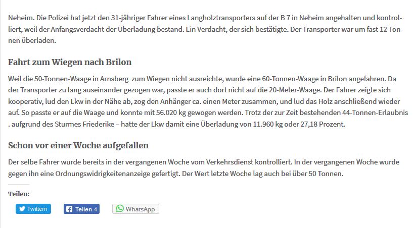Nun steht heute wieder ein Bericht in unserer virtuellen Zeitung, dass man denselben Fahrer wieder erheblich überladen erwischt hat. Man hat dann wohl eine Riesengeschichte daraus gemacht.