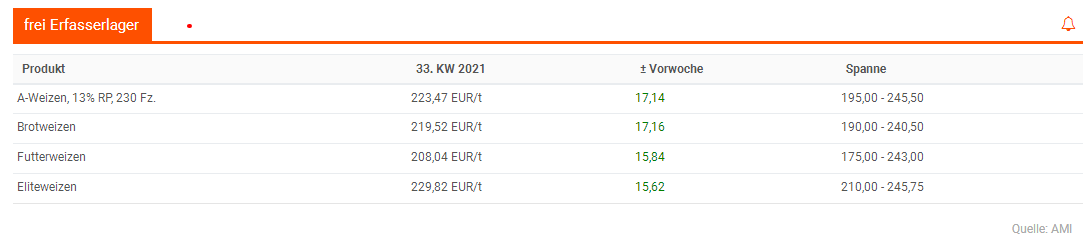 Du musst aber erst welche finden, die das bezahlen. Mein Nachbar kam gestern zu mir und fragte mich, ob ich noch Bedarf an Gerste habe, weil die Lagerhäuser in der Umgebung immer noch 16,5 bis 17€/dt (wie in der Ernte und keinen € mehr) bezahlen.julius hat geschrieben:Die Preise gingen jüngst nochmal hoch für Weizen hier AMI Preise für Erzeuger als grobe Richtlinie was zurzeit bezahlt wird. Eliteweizen schon fast 23 Euro netto wird aber kaum jemand haben wegen zuwenig RP :