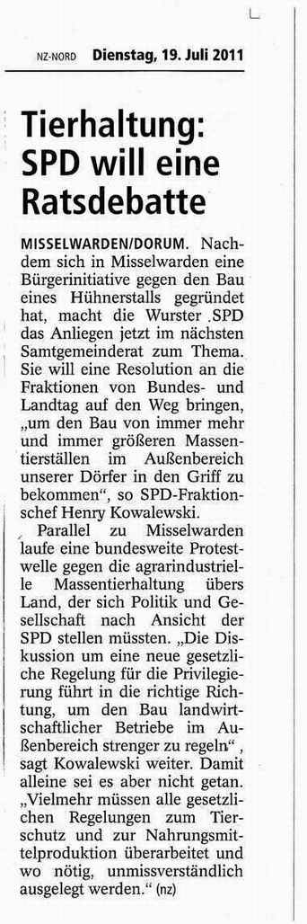 Hier bei uns hat sich mal wieder eine Bürgerinitiative gegründet um einen Stallbau zu verhindern. Es geht um einen Zuchtstall für Küken zur Hähnchenmast. Es sind 56000 Plätze in 2 Einheiten geplant. Die SPD hat sich jetzt der Bürgerinitiative angeschlossen und will der Privilegierung landwirtschaftlicher Bauten im Außenbereich zu Leibe rücken. Dieser Artikel war gestern in der Nordsee-Zeitung zu lesen: