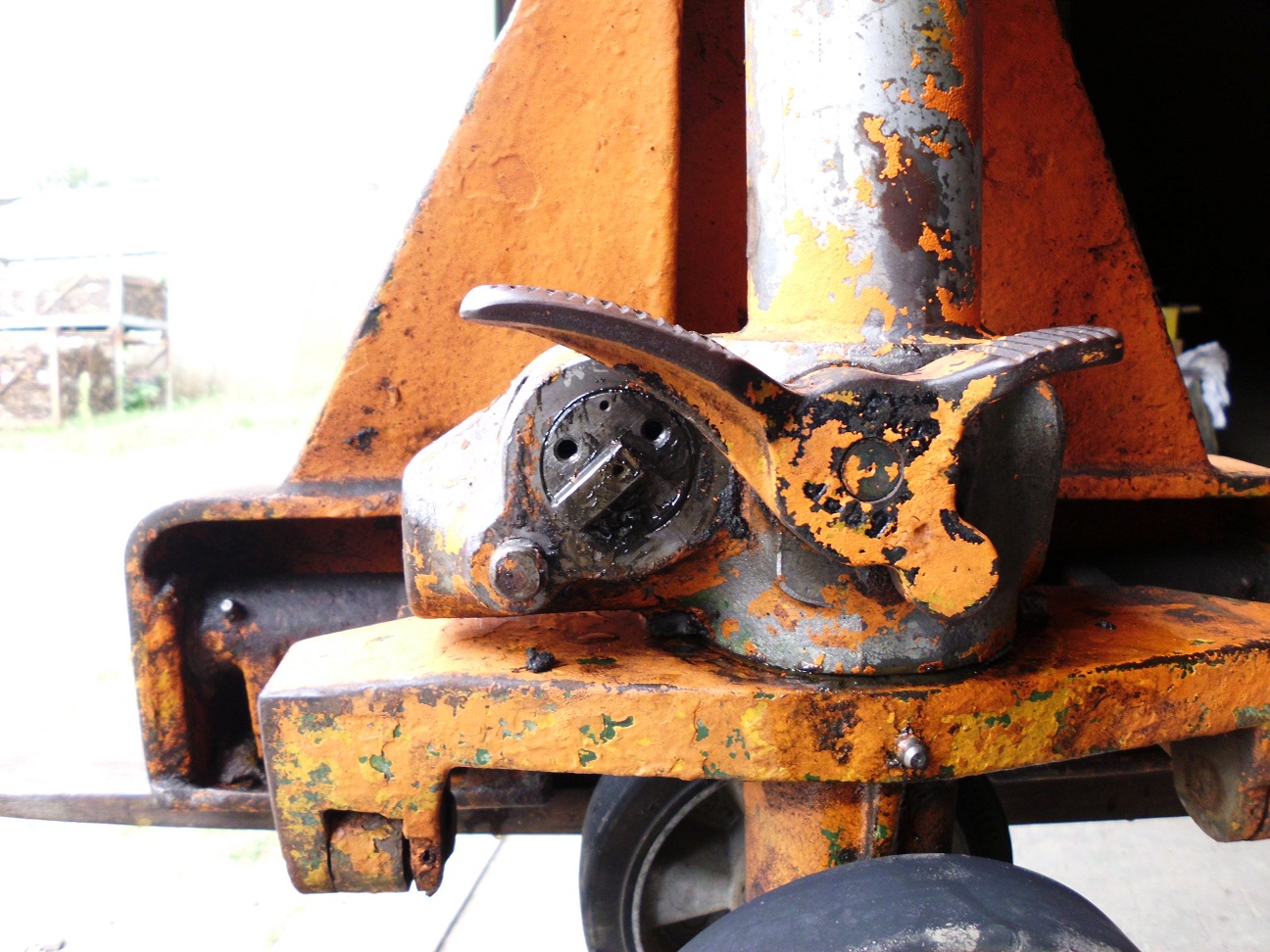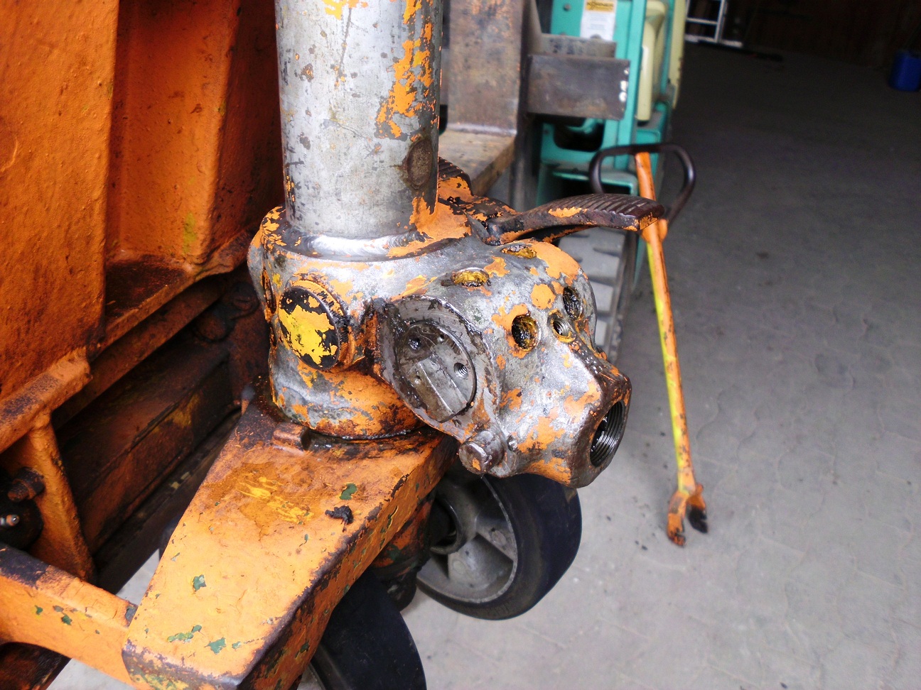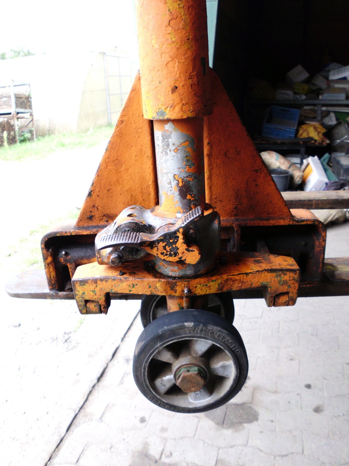 Heute morgen kam er damit angerollert um noch mehr leere Paletten zu holen, und als er gerade die Auffahrt raufwollte machte es einmal "Knack" und der Pump/Zughebel lies sich nicht mehr auf oder ab bewegen.