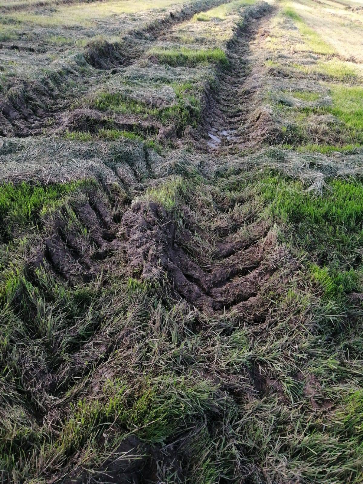 Das ist bei uns hier ein Bild, das es oft zu sehen gibt, nicht nur im Grünland, auch auf dem Acker. Die großen exKolchosen, und auch der großen Privatbetriebe, die nach der Wende entstanden sind, fahren rein nach Kalender, nicht nach Wetter. Einfach weil sie es sonst, mit ihren Minimalbesatzungen mit ihren überschwerne Maschinen, die die Arbeitskraft ersetzen sollen, zeitlich nicht mehr schaffen. Sicher, so ein Großtraktor schafft deutlich mehr hektar in der Stunde, kann sich aber auch nicht aufteilen, udn so bald Jahre kommen, in denen die trockenen Fenster immer kleiner werden, passiert dann sowas wie auf den Bildern, da wir auch eine ziemlich nasse Ecke sind.