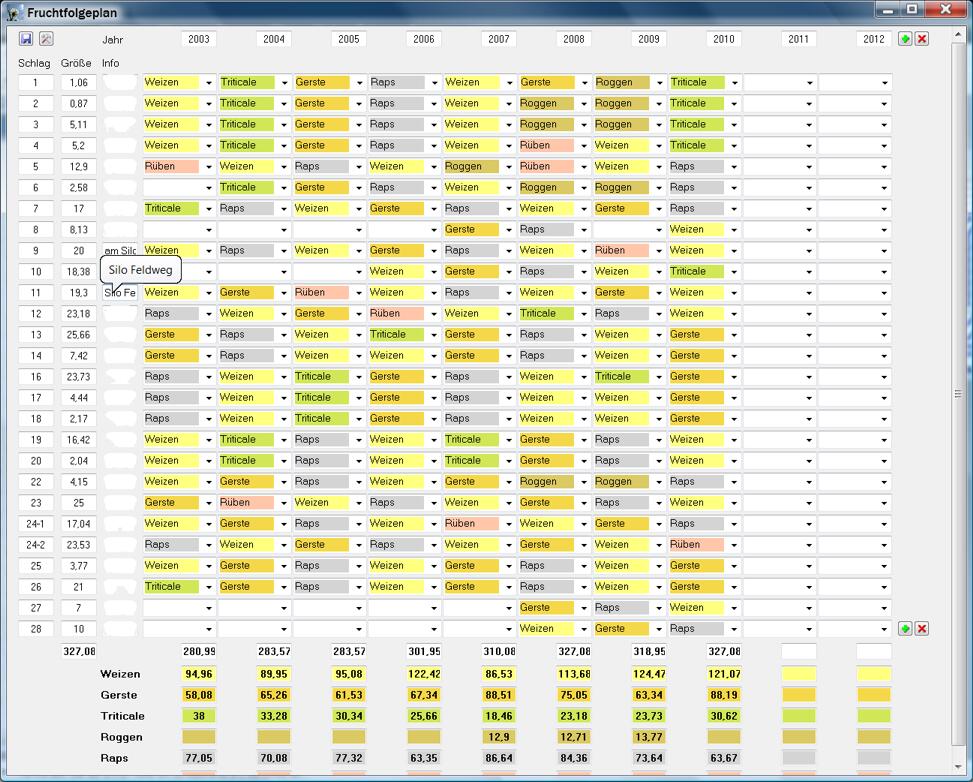 spunky hat geschrieben:gibt es ein kostenloses programm oder eine tabelle (excel, pdf), wo man seine bisherigen feldstücke, hektar, jahr, fruchtart eingeben kann und womit man leicher paar jahre im vorraus planen kann.