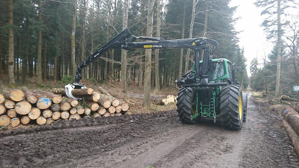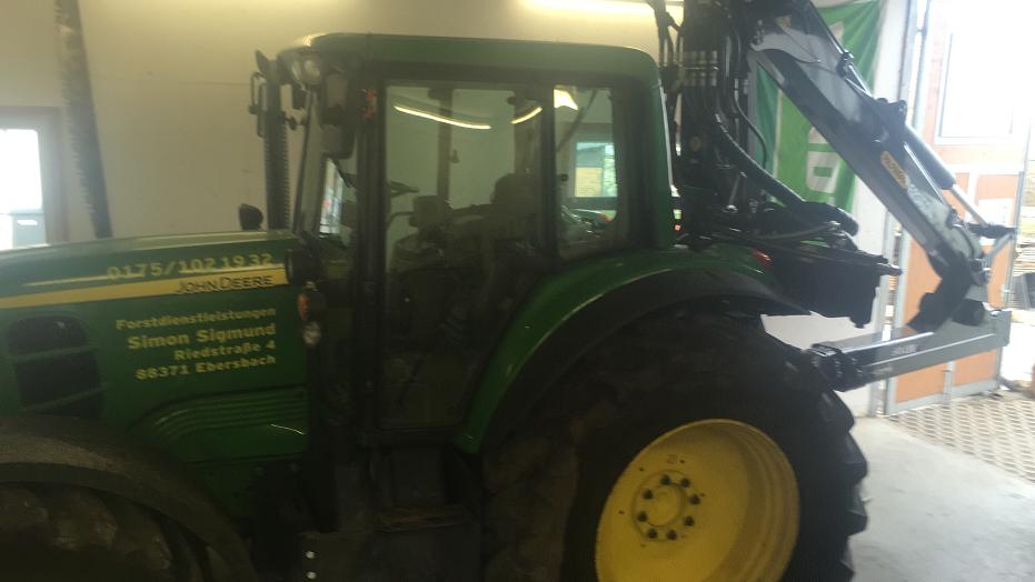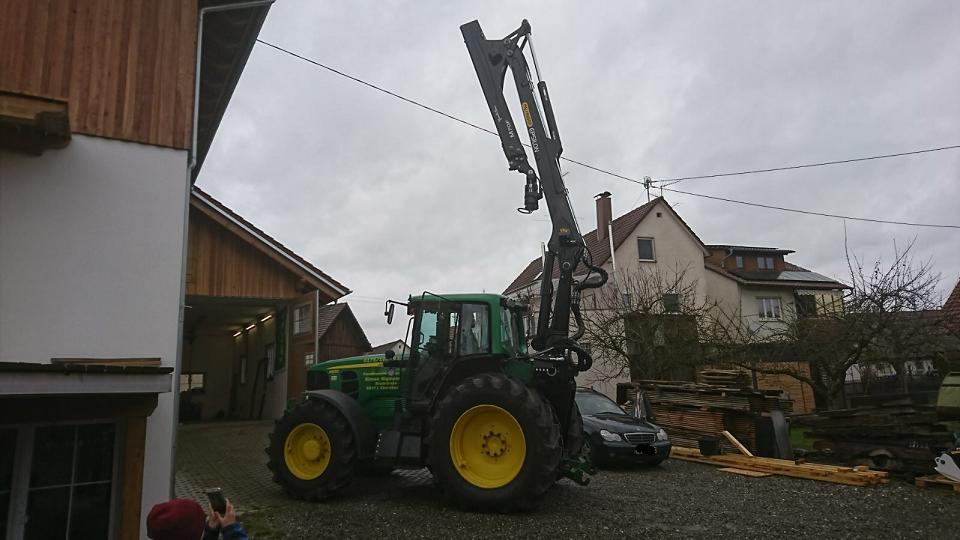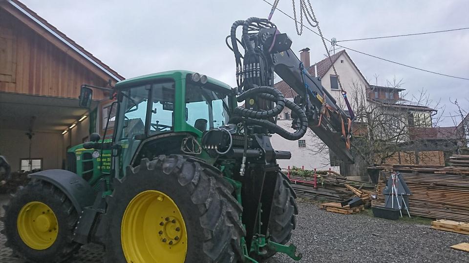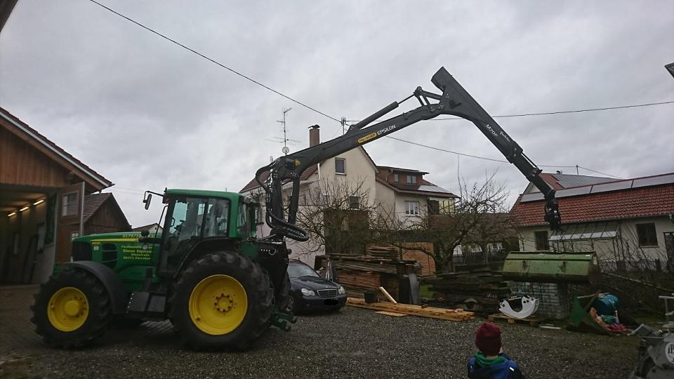 Allerdings hat der Deere schon relative Schräglage durch die Kranauslage. Da müssen sicherlich noch Kranstützen oder mindestens Vorderachs-Verblockung her, wenn die volle Kranauslage genutzt werden soll.