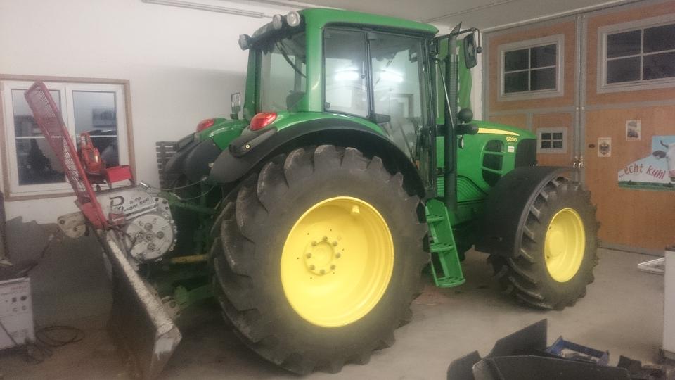 Es geht um Folgendes: Ich habe steigenden Bedarf an einem Schlepper mit Ladekranaufbau, weshalb ich mich von meinem guten 311er, bekannt aus Bilder Forstarbeiten, trennen will. Da eine Rahmenbauweise das Projekt wesentlich erleichtert habe ich mich auf die Suche gemacht und mir einen jungen gebrauchten JD 6830Premium zugelegt.