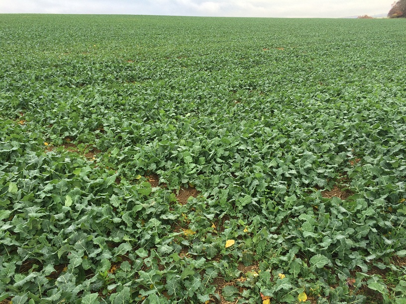Ich bin froh, wenn ich auf eine Zielbestandesdichte von 20-30 Pfl./m² komme, und viel mehr säe ich auch nicht aus. Das sieht zwar mitunter nicht sehr schön aus, insb. dann, wenn der Raps etwas ungleichmäßig aufläuft, Stroh und Ausfallgetreide ihm das Leben schwer machen oder wenn einfach kein richtiges Wachstum da ist, weil es zu trocken ist. Der Raps ist aber ungemein kompensationsfähig und wenn die Bedingungen im Herbst etwas günstiger sind, kann er binnen 1-2 Wochen den Entwicklungsrückstand wieder wettmachen, vorausgesetzt der Bestand ist unkrautfrei und gut mit Nährstoffen versorgt.