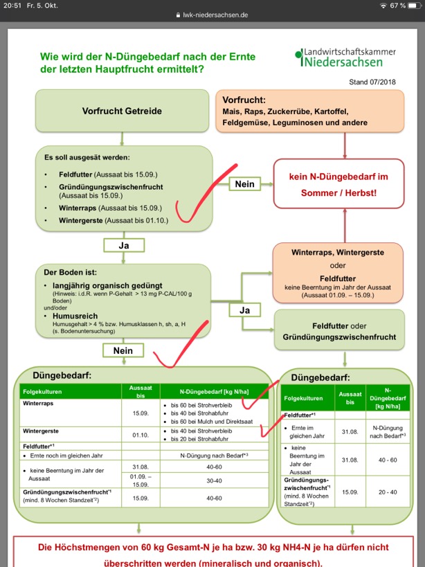 1. November - 31. Januar für Grünland, mehrjähriges Feldfutter nach Ernte - 31. Januar für Ackerland Abweichend davon ist Düngung auf Ackerland bis zur Höhe des N-Düngebedarfs, maximal bis 60 kg/ha Gesamt-N oder 30 kg/ NH4-N, möglich bis 1. Oktober zu W-Raps, ZF, Feldfutter (bei Aussaat bis 15.9.) oder zu W.- Gerste nach Getreide (bei Aussaat bis 01.10.), bis zum 1. Dezember zu Gemüse. Keine Ausgleichsdüngung mehr zu Stroh!