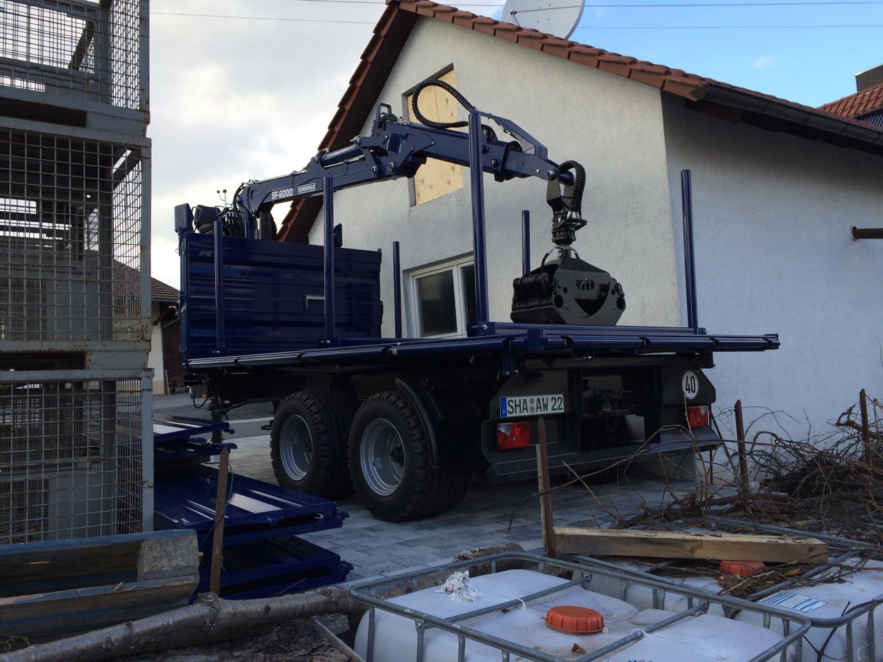 selbst wenn es nur 1,5 km weit weg ist und der ladet Stamme bis 21 m die muss man mit dem Forstkran in 4 Stücke zersägen